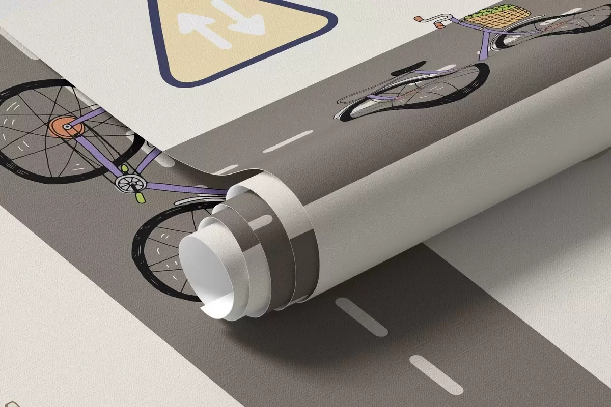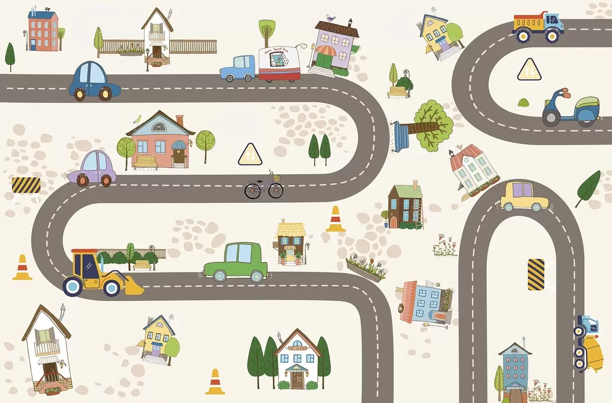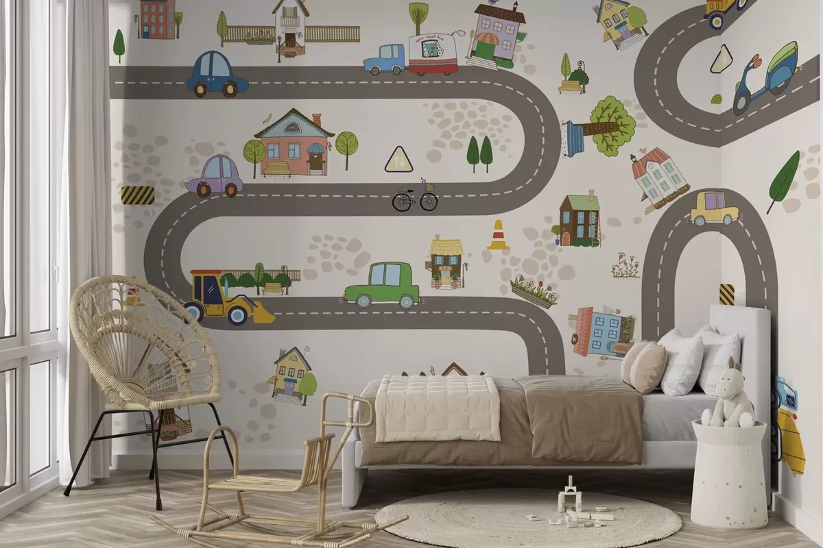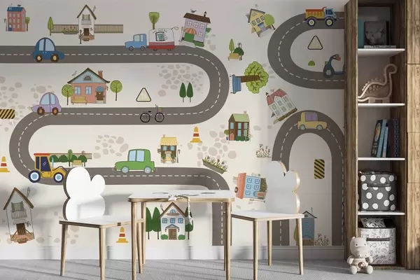 Murais de parede Estrada para crianças com carros e casas coloridas Nr. w04404
