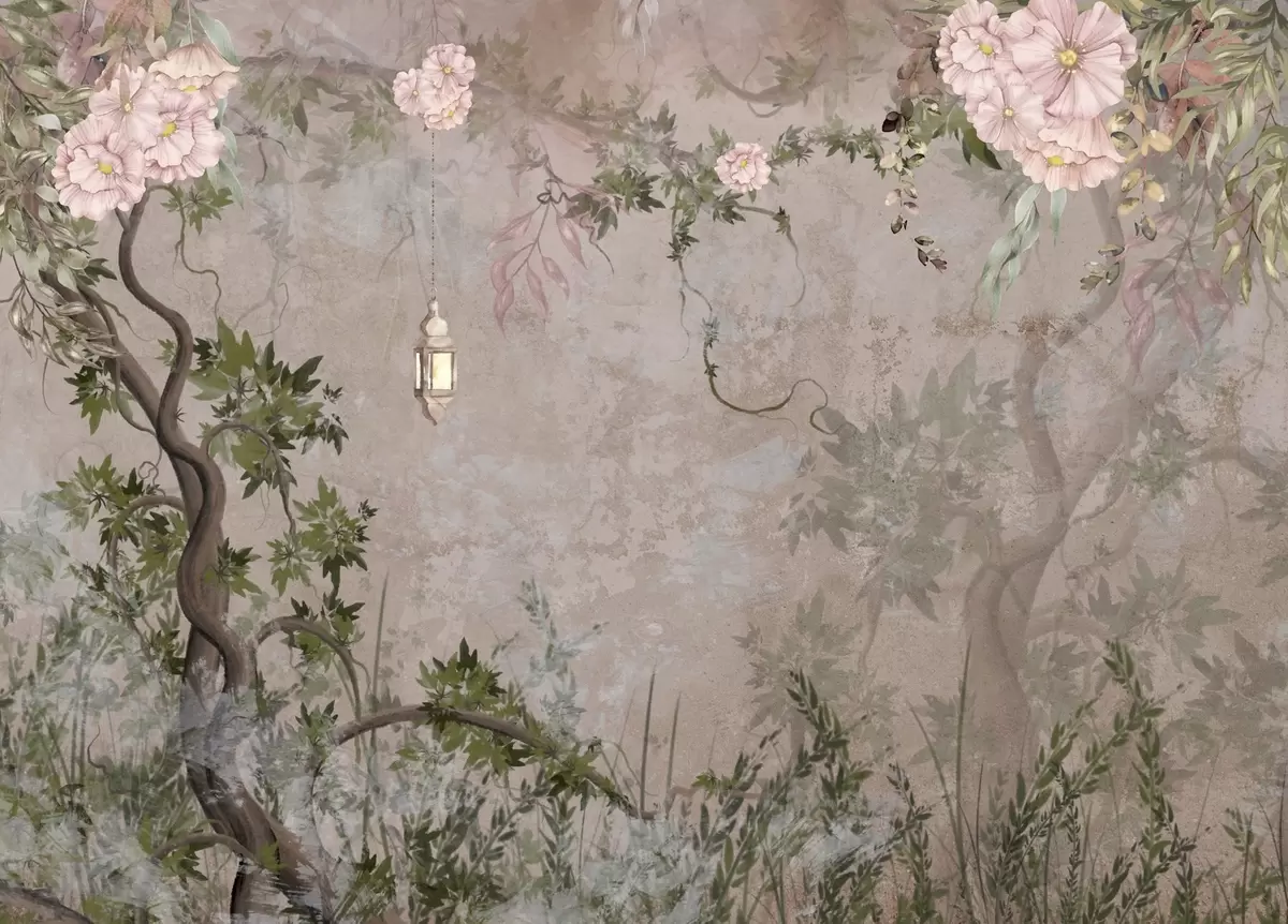 Murais de parede Jardim de fadas com flores, árvores e lanterna Nr. w04416