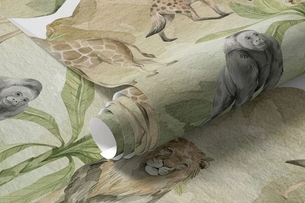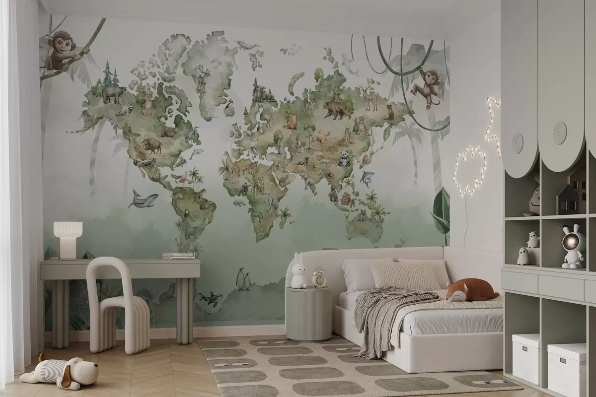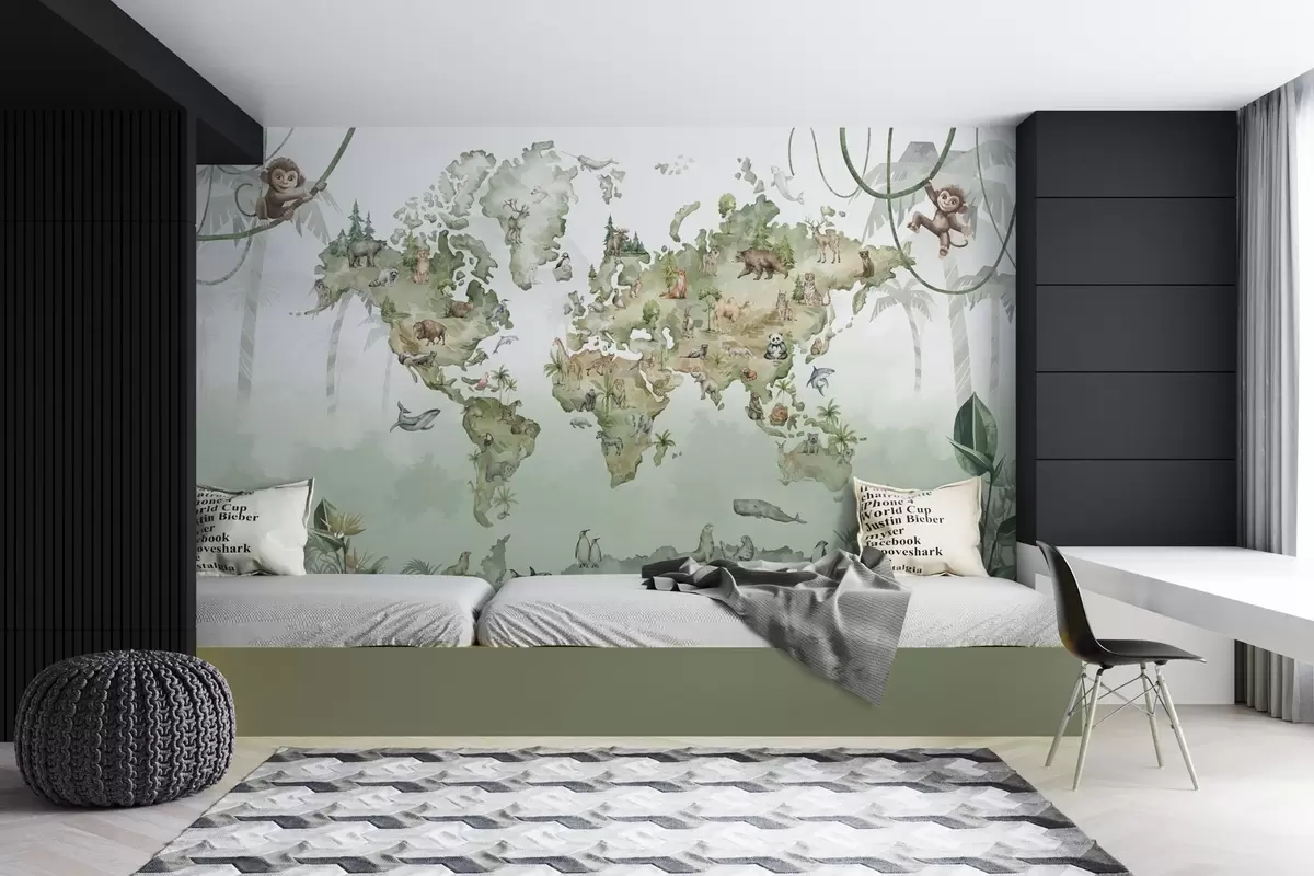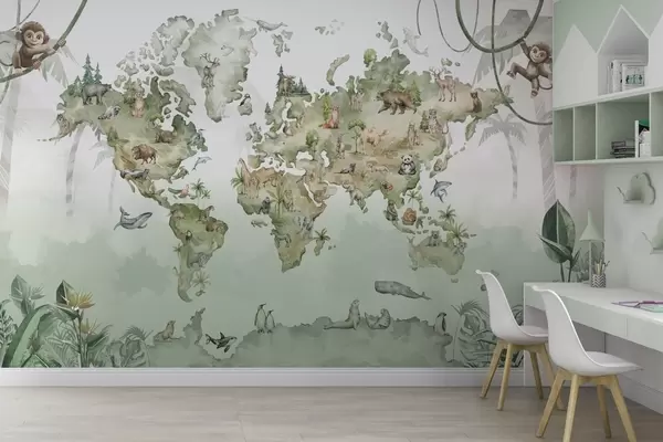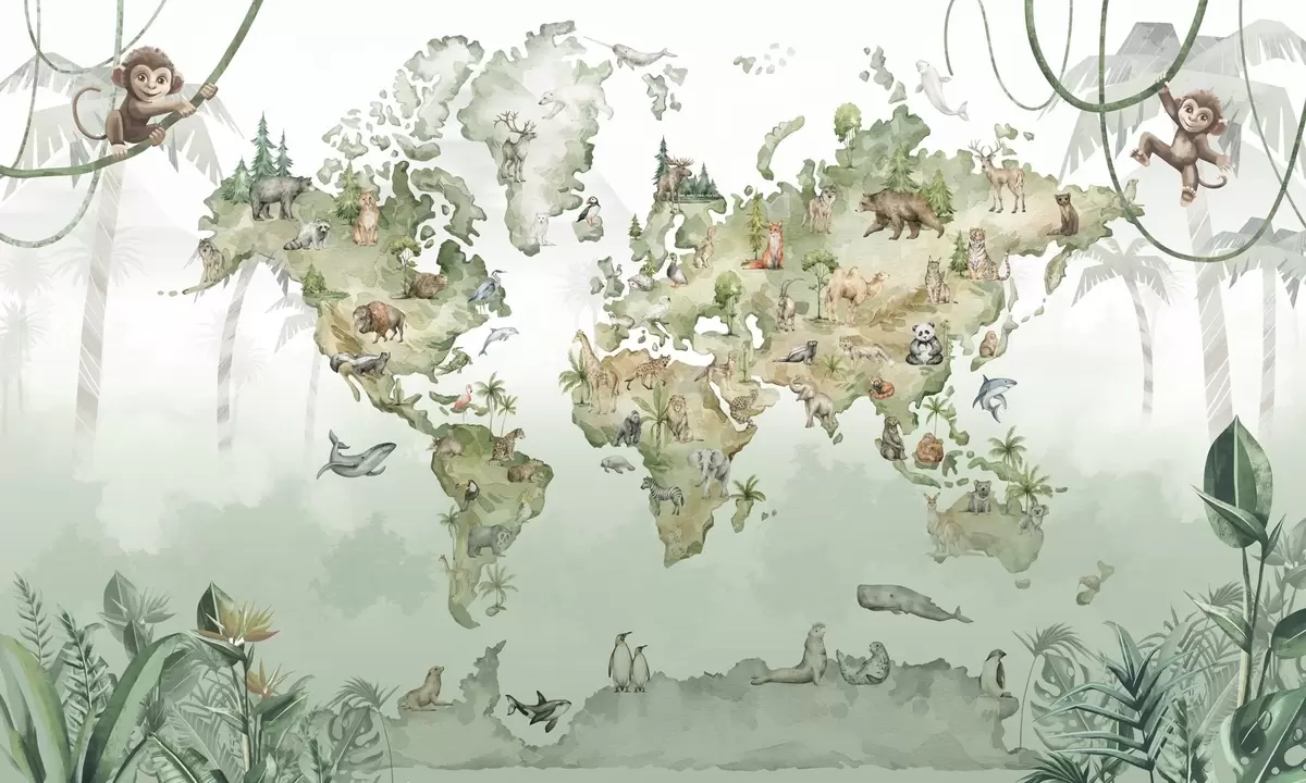 Murais de parede Mapa-mundo em estilo aguarela com animais Nr. w04418