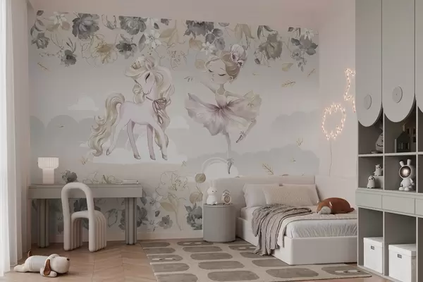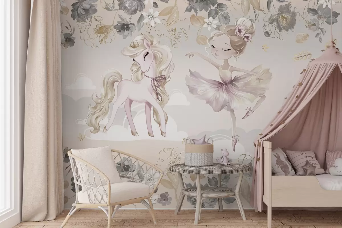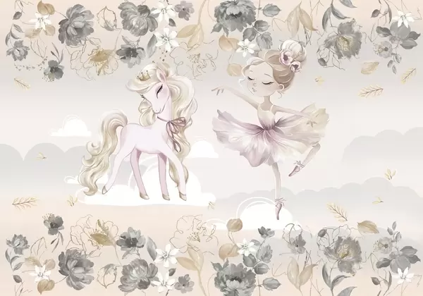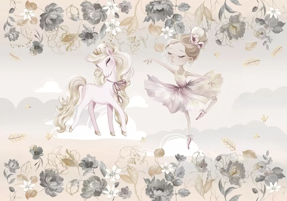 Murais de parede Pónei branco e bailarina entre flores e nuvens Nr. w04419