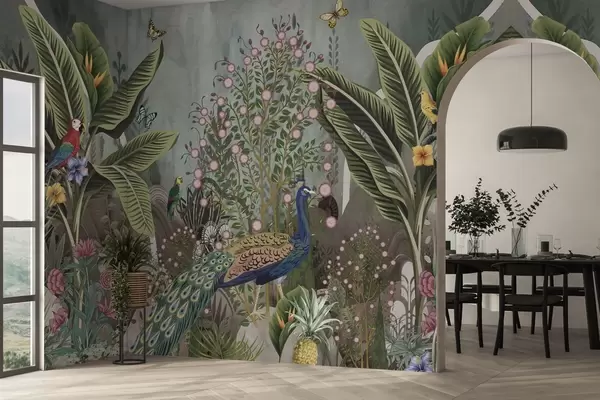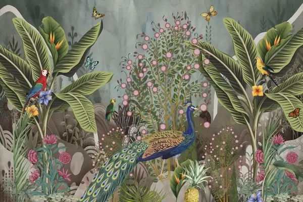 Murais de parede Aves tropicais brilhantes e pavão entre plantas exóticas Nr. w04457