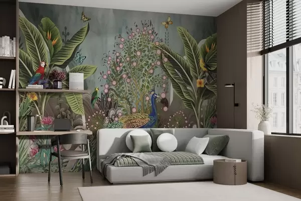 Murais de parede Aves tropicais brilhantes e pavão entre plantas exóticas Nr. w04457