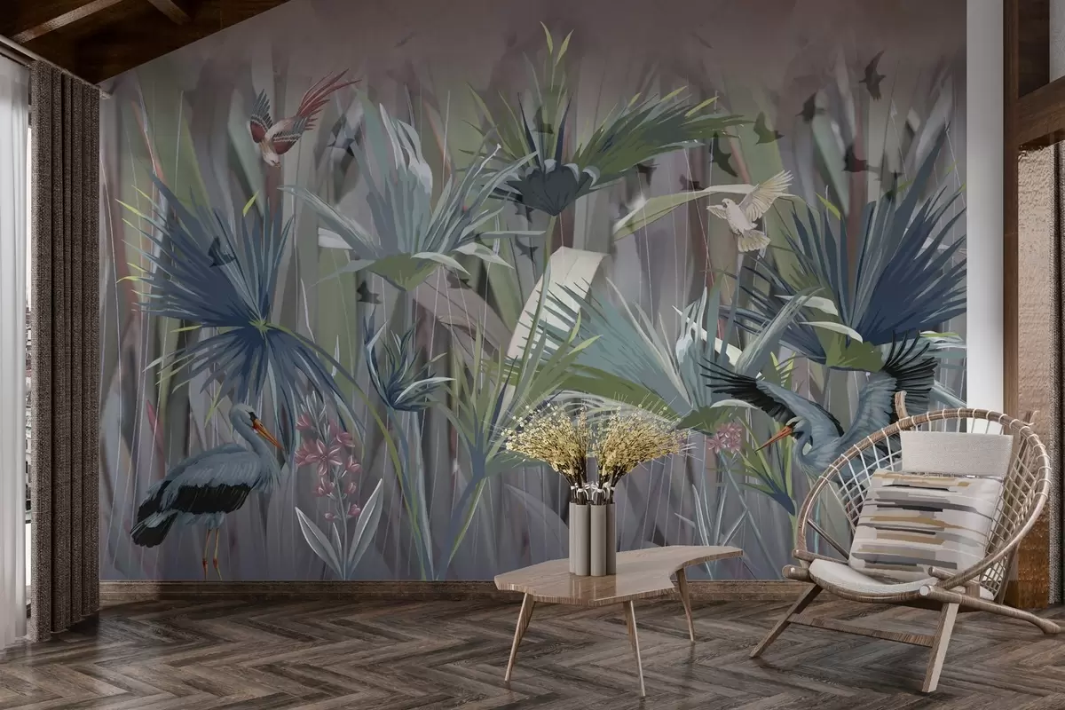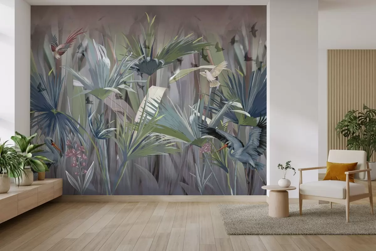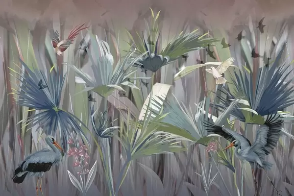 Murais de parede Aves exóticas entre folhas de palmeira e flores Nr. w04458