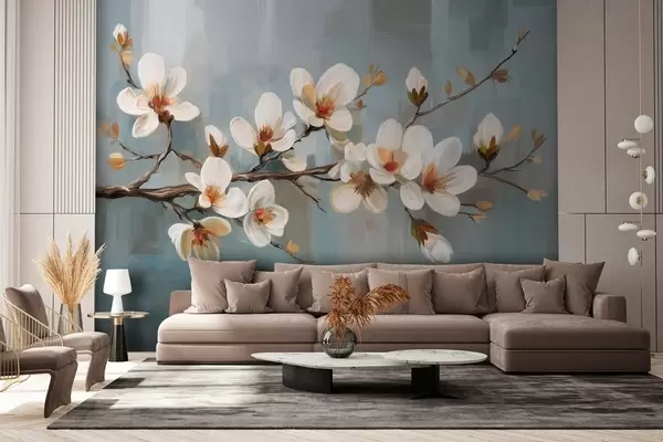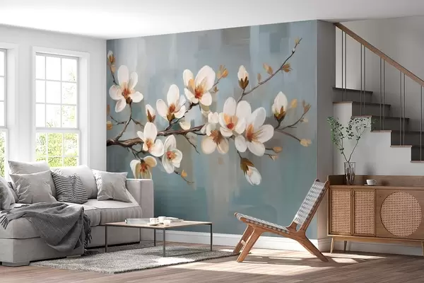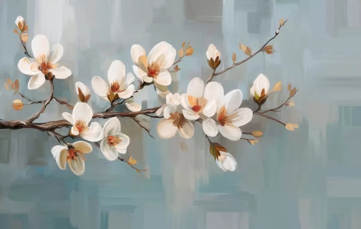 murais de parede Um ramo em flor ao estilo de uma pintura a óleo sobre um fundo azul w04496