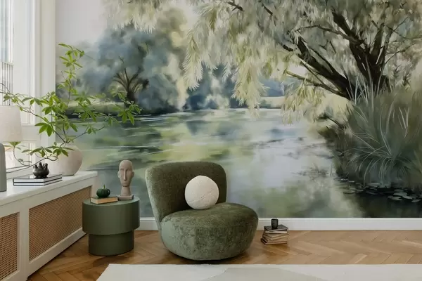 Murais de parede árvore em estilo aquarela acima do lago Nr. w04501