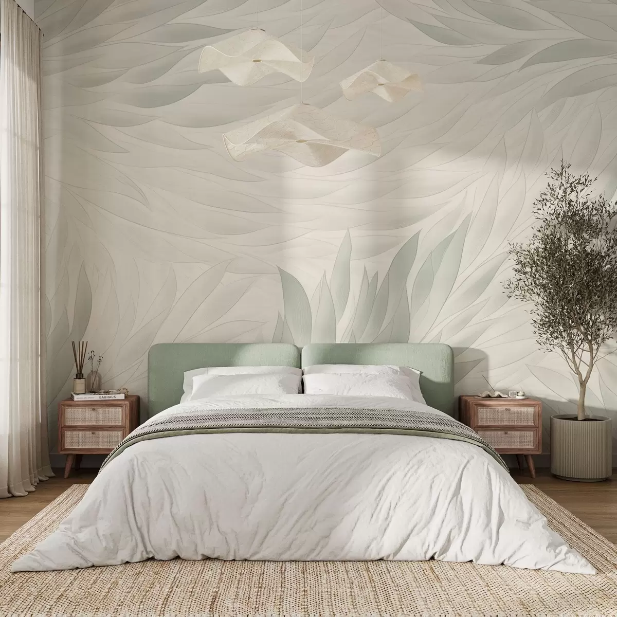 Murais de parede Folhas onduladas em suaves tons de verde-bege Nr. w04610v2