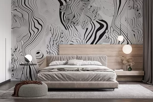Murais de parede formas orgânicas abstratas em estilo 3D em tons de branco e cinza com listras pretas Nr. w04627