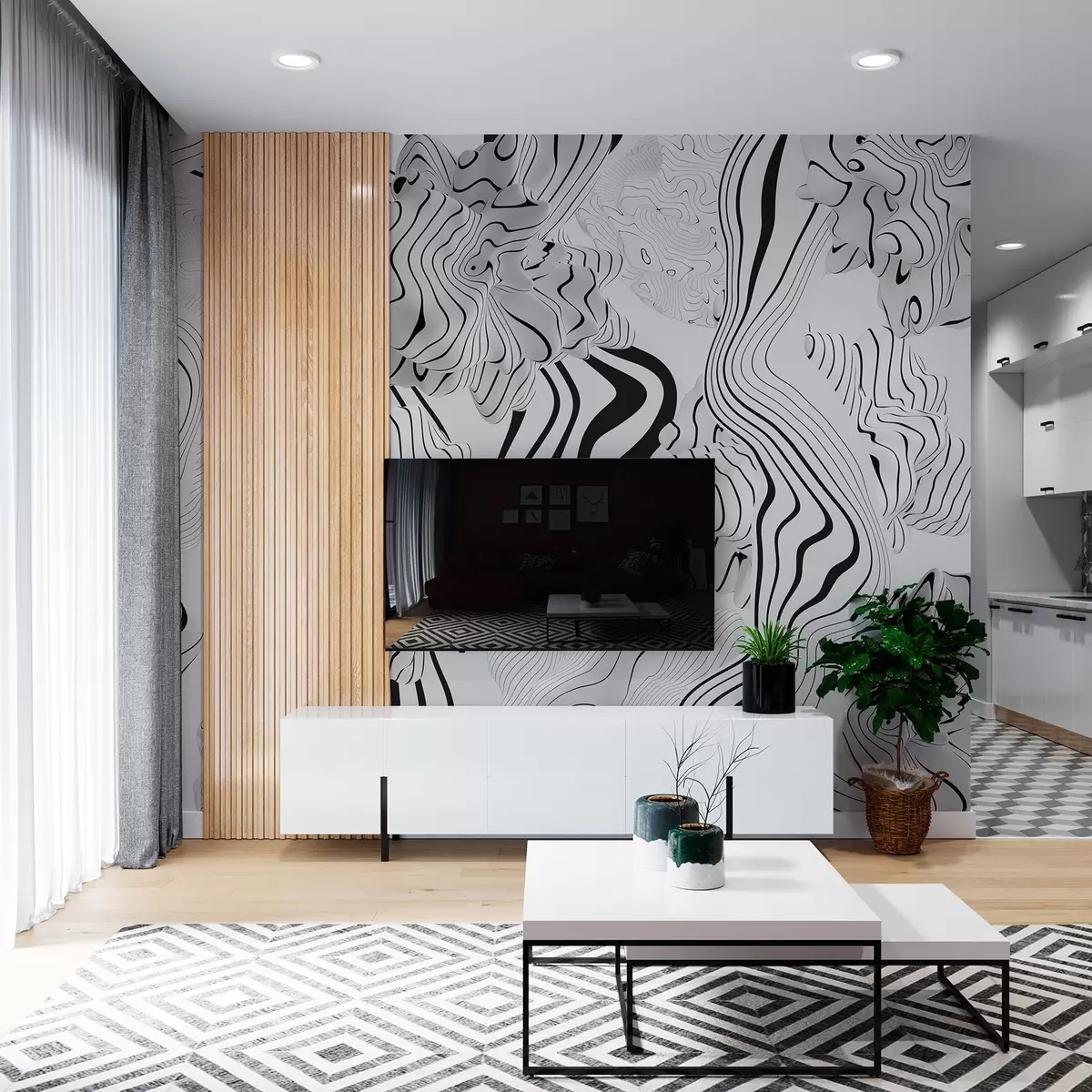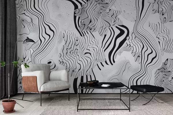 Murais de parede formas orgânicas abstratas em estilo 3D em tons de branco e cinza com listras pretas Nr. w04627