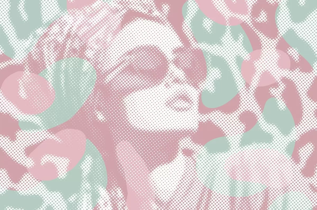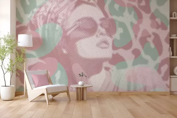 Murais de parede retrato de uma mulher sobre um fundo de leopardo em estilo pontilhado em tons de rosa e verde Nr. w04630v2