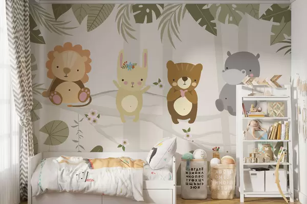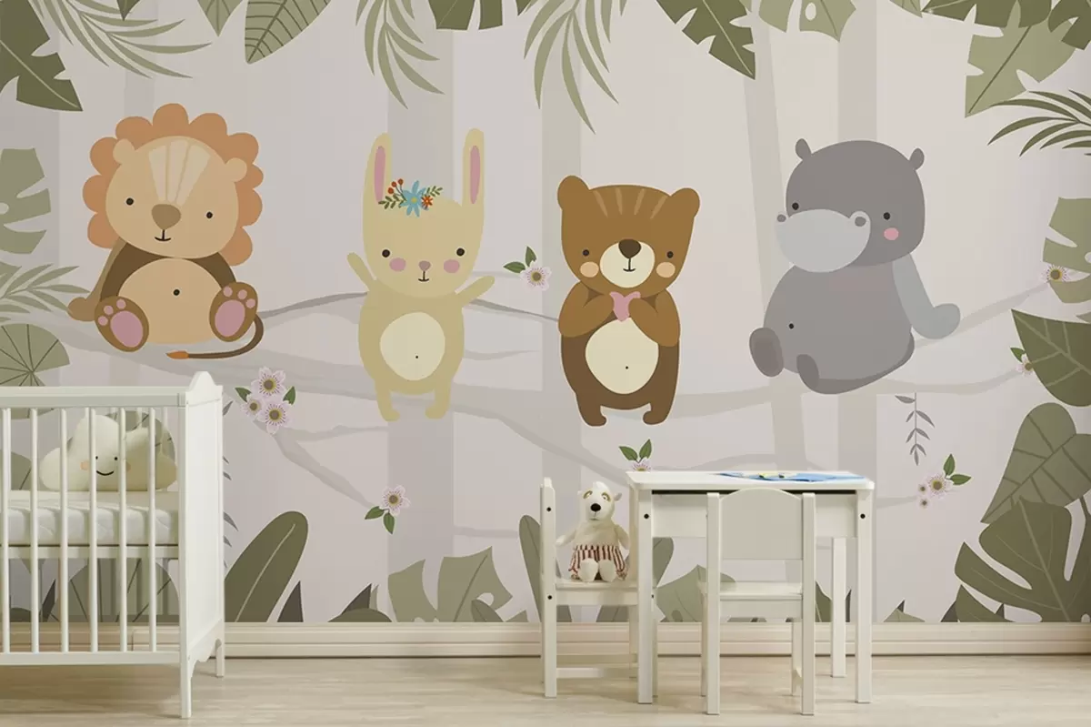 Murais de parede Leão, coelho, urso e hipopótamo fofos entre as folhas Nr. w04682