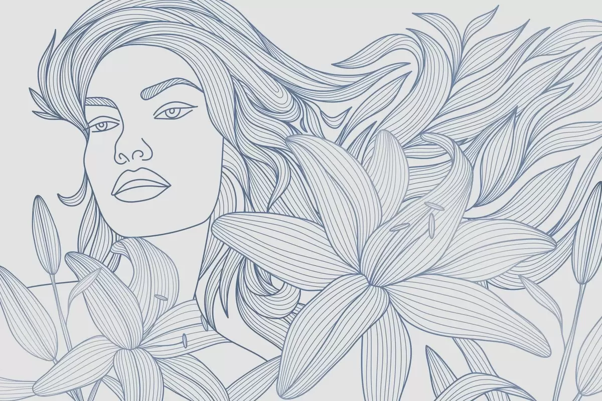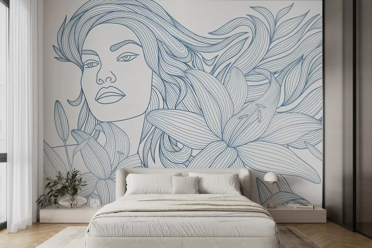 Murais de parede Retrato de uma menina em tons de azul com flores de lírio Nr. w04689v2