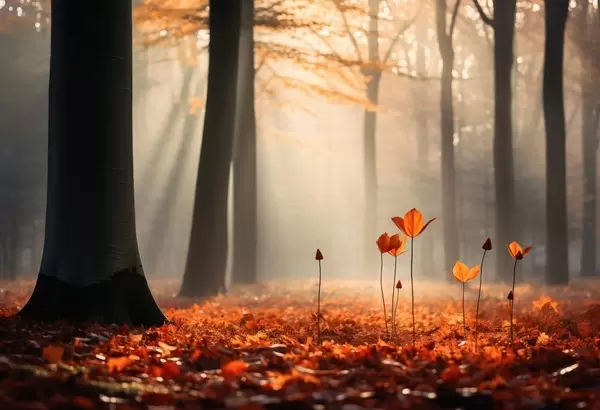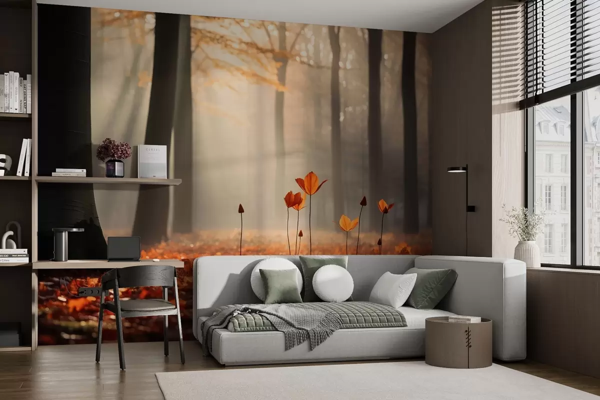 Murais de parede Floresta no outono com raios de sol e folhagem brilhante Nr. w04710