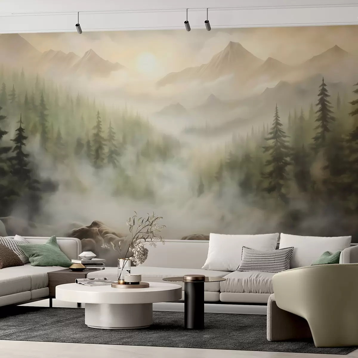 Murais de parede Floresta no nevoeiro com as montanhas ao fundo Nr. w04730