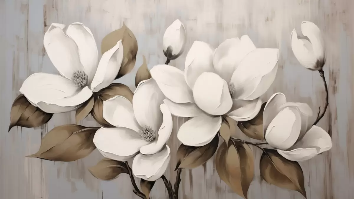 Murais de parede Grandes flores de magnólia com folhas cinza-acastanhadas sobre fundo escovado Nr. w04785