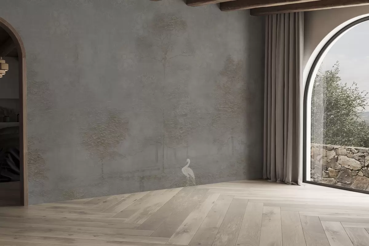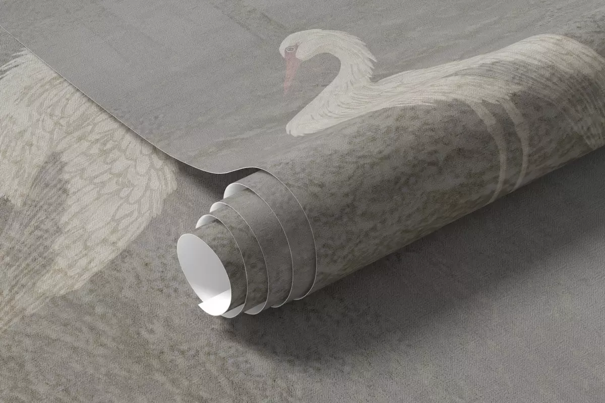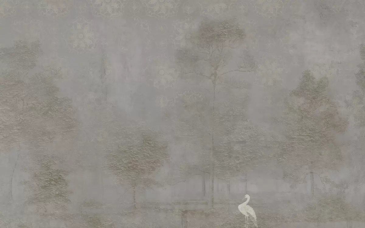 Murais de parede Floresta enevoada com uma garça e um padrão ornamental acima Nr. w04953v1