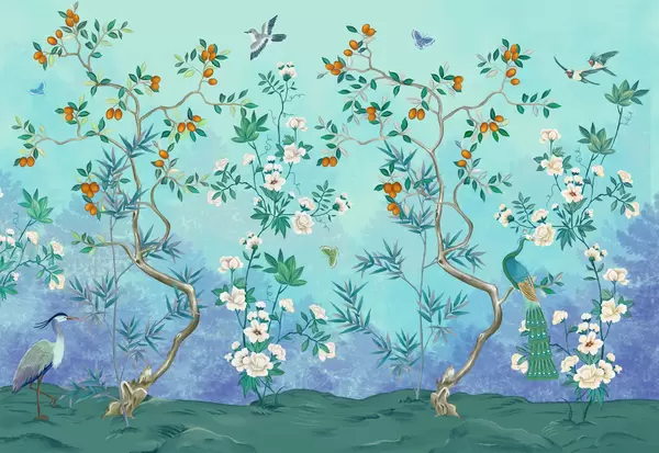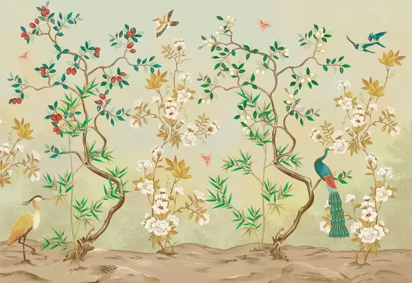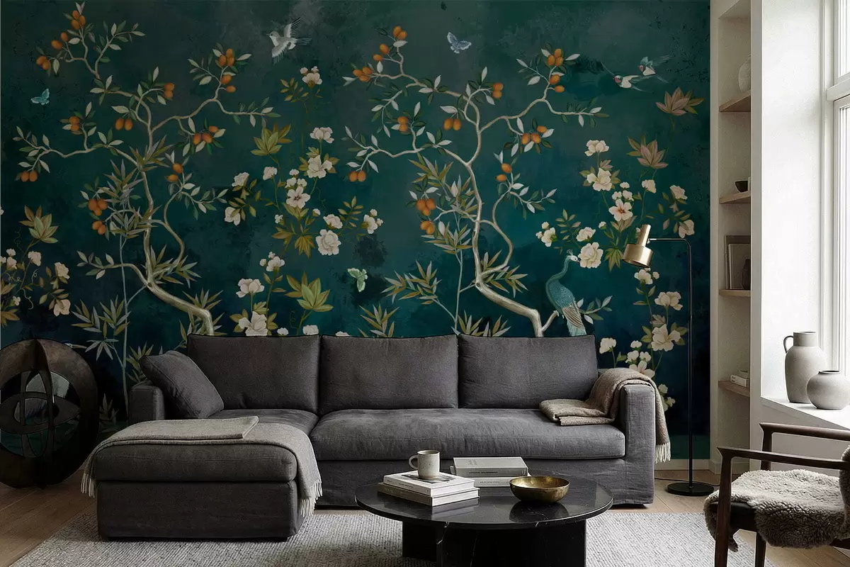 Murais de parede Cena decorativa com árvores, flores e pássaros sobre fundo escuro Nr. w05004