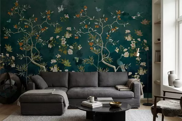 Murais de parede Cena decorativa com árvores, flores e pássaros sobre fundo escuro Nr. w05004