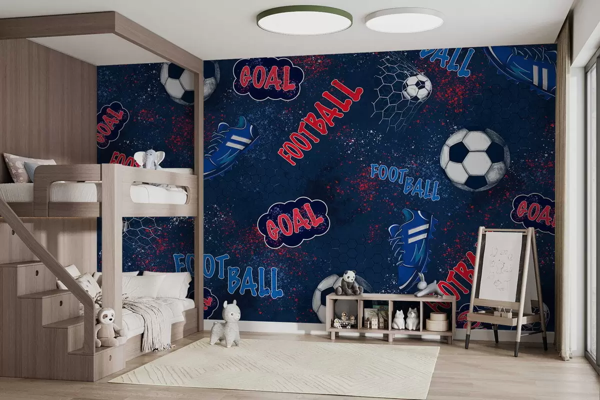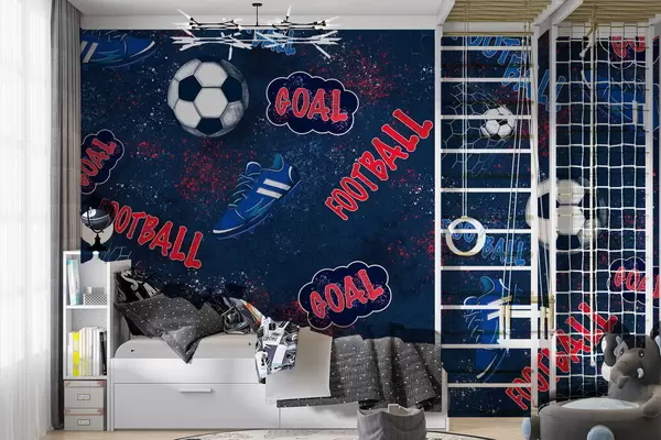 Murais de parede Padrão repetitivo com bolas, chuteiras e elementos de texto Nr. w05037v2