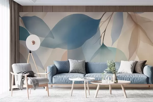 Murais de parede folhas elegantes e semitransparentes em tons de azul e bege Nr. w05060
