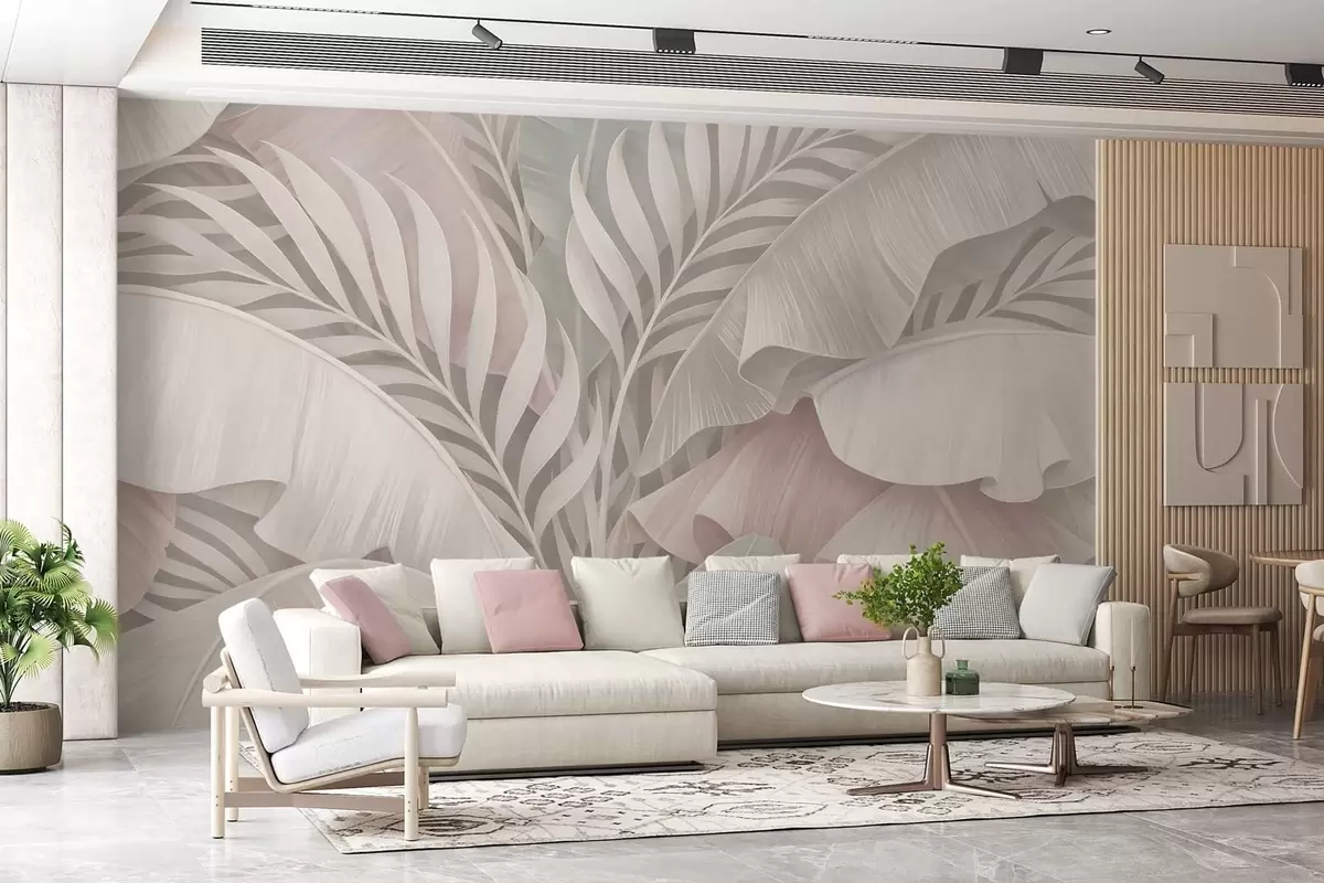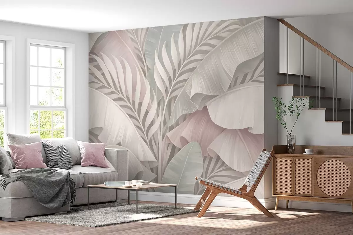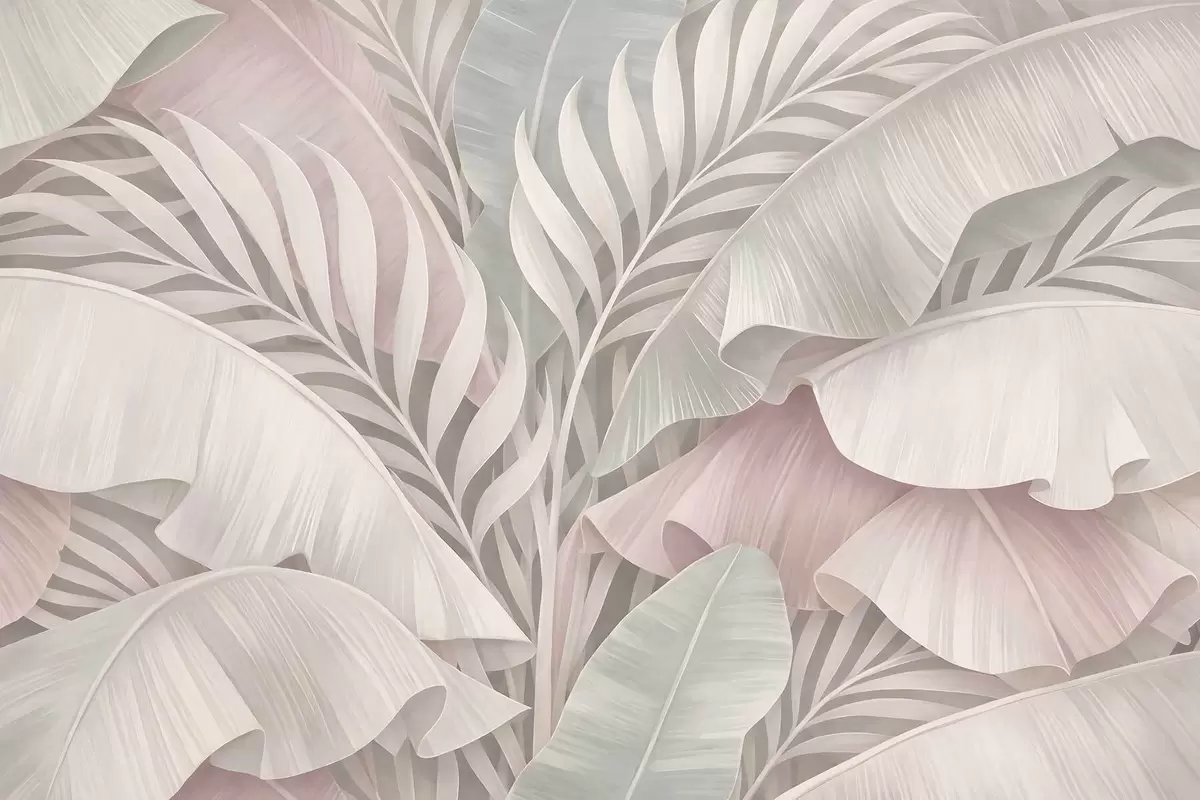 Murais de parede folhas tropicais grandes em tons suaves de rosa e cinza Nr. w05062v1