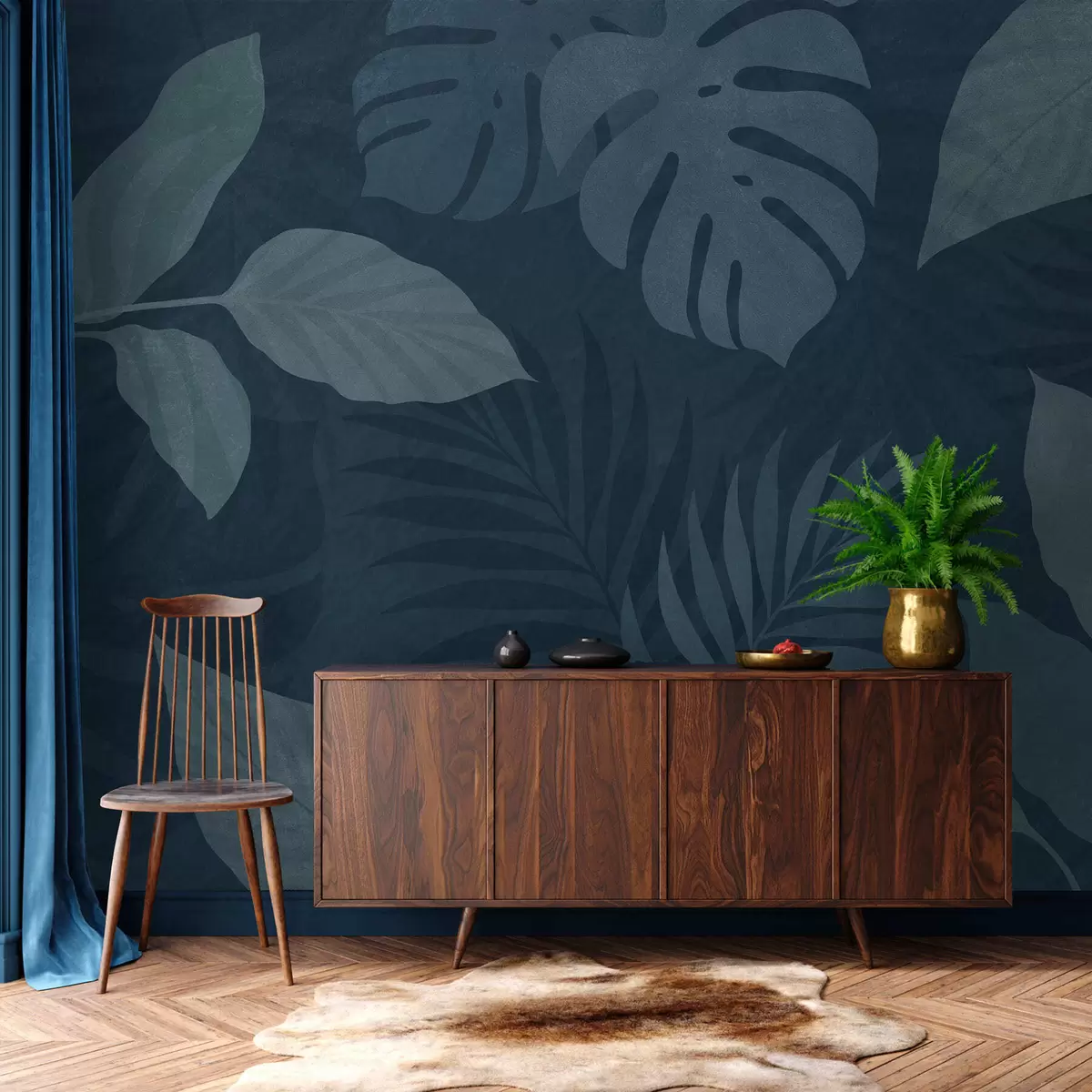 Murais de parede folhas tropicais texturizadas sobre um fundo azul escuro Nr. w05063v3