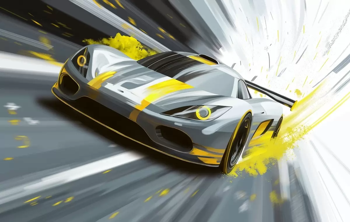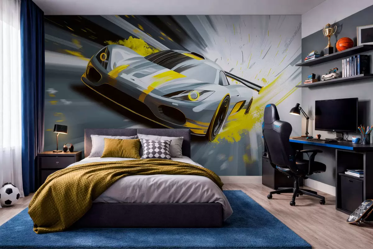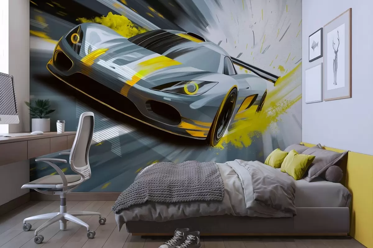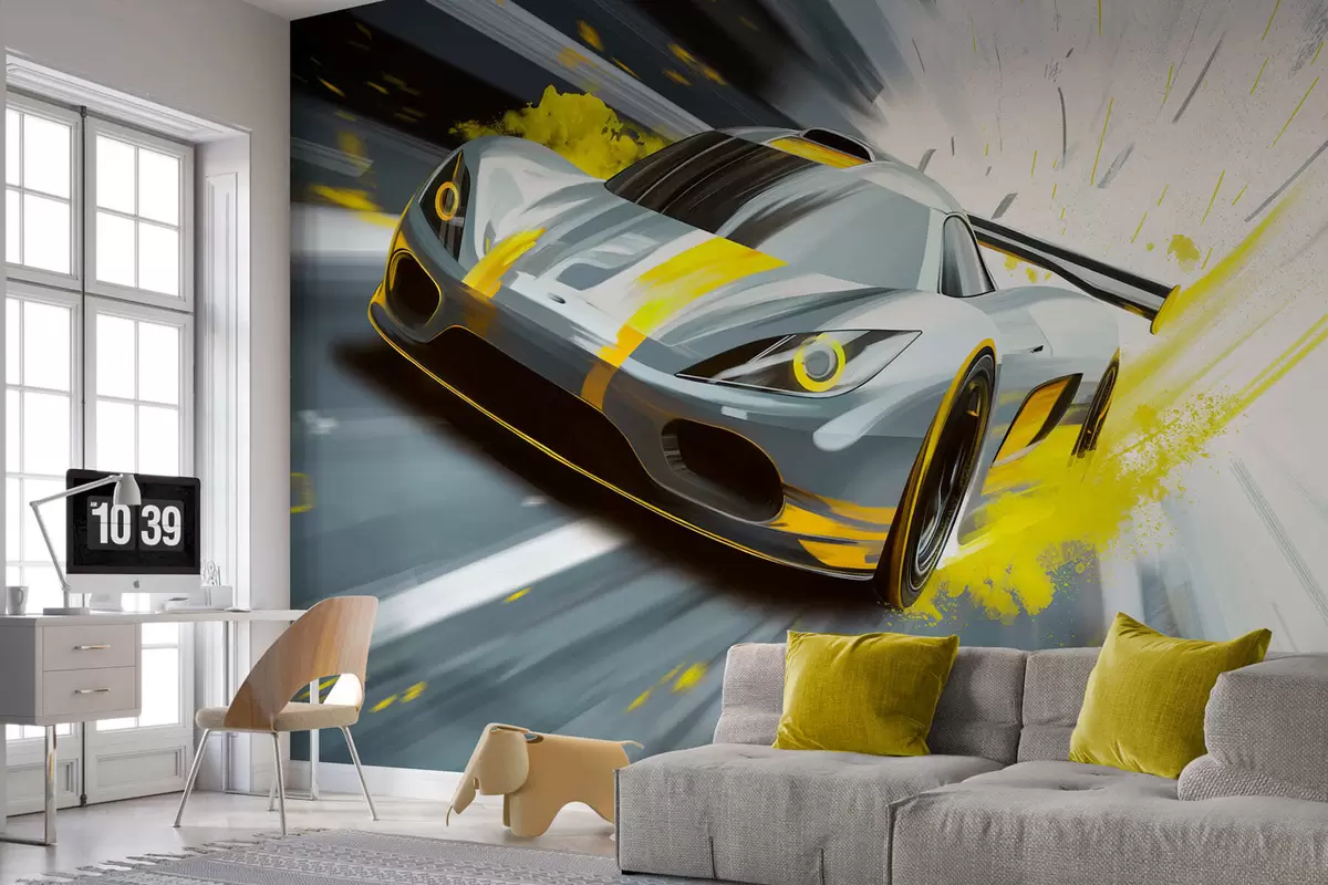 Murais de parede carro desportivo dinâmico em estilo de desenho digital com detalhes em amarelo Nr. w05069v2