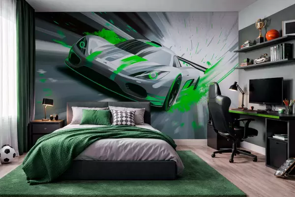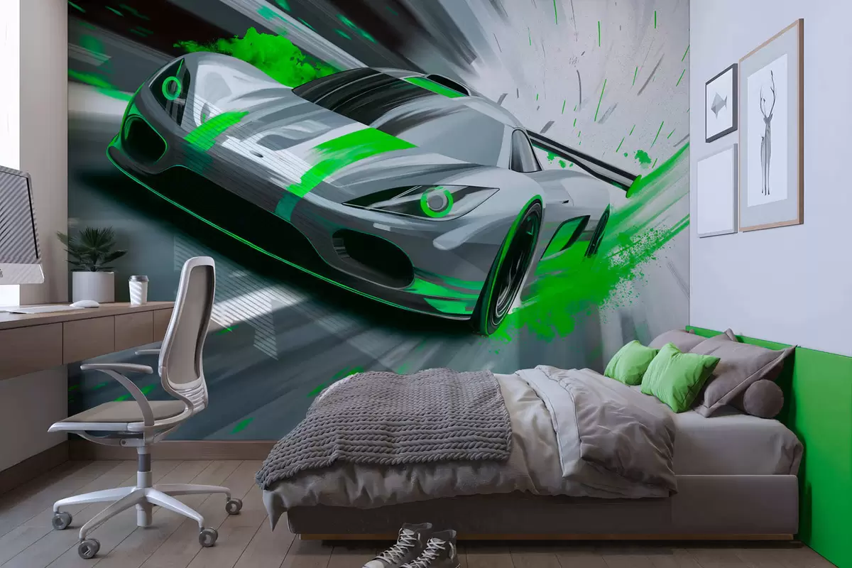 Murais de parede carro desportivo dinâmico em estilo de desenho digital com detalhes em verde Nr. w05069v4