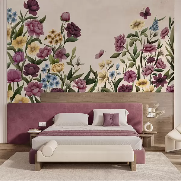 Murais de parede Composição floral com plantas e borboletas sobre fundo claro Nr. w05072