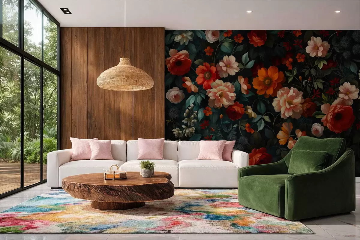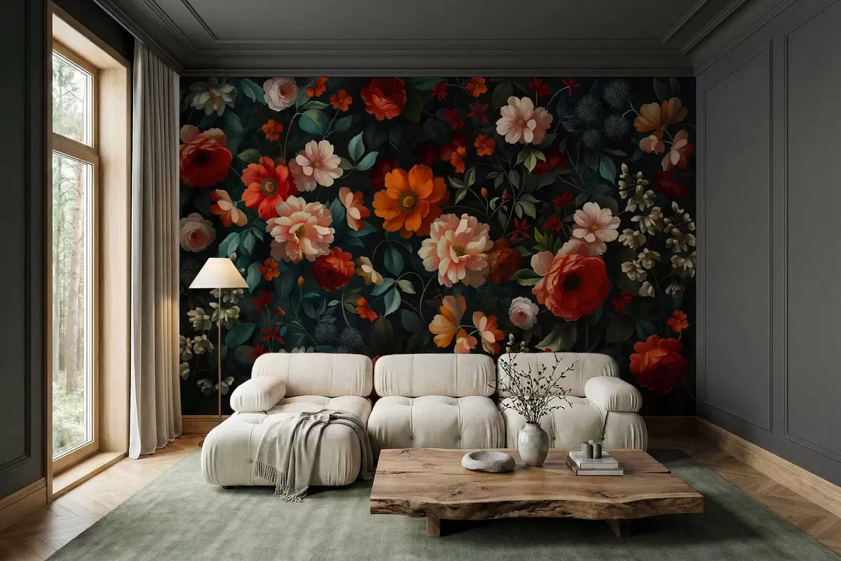 Murais de parede Padrão floral escuro com flores exuberantes de jardim Nr. w05087