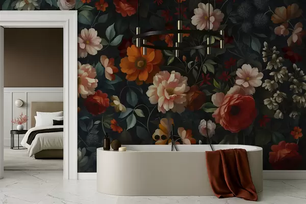 Murais de parede Padrão floral escuro com flores exuberantes de jardim Nr. w05087