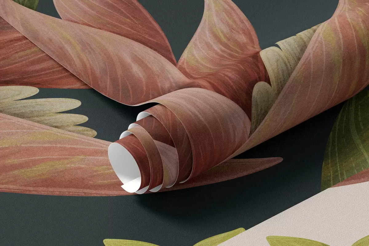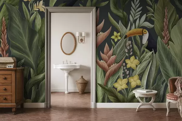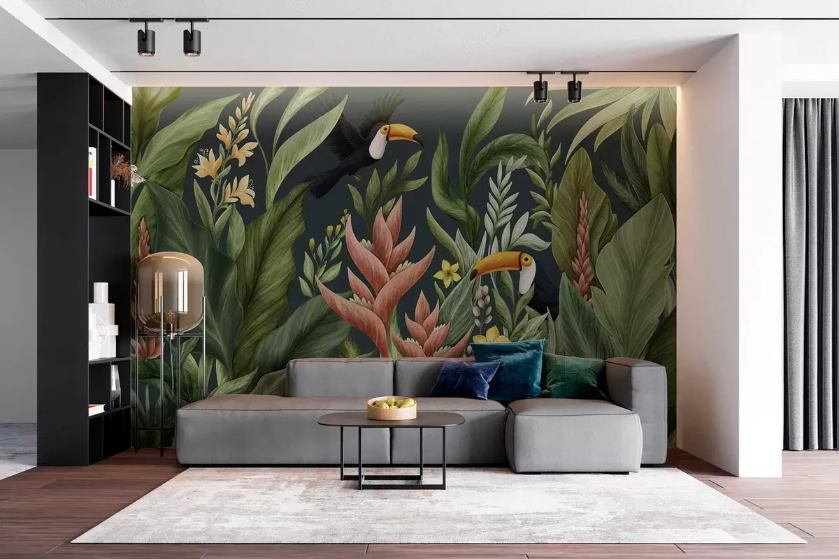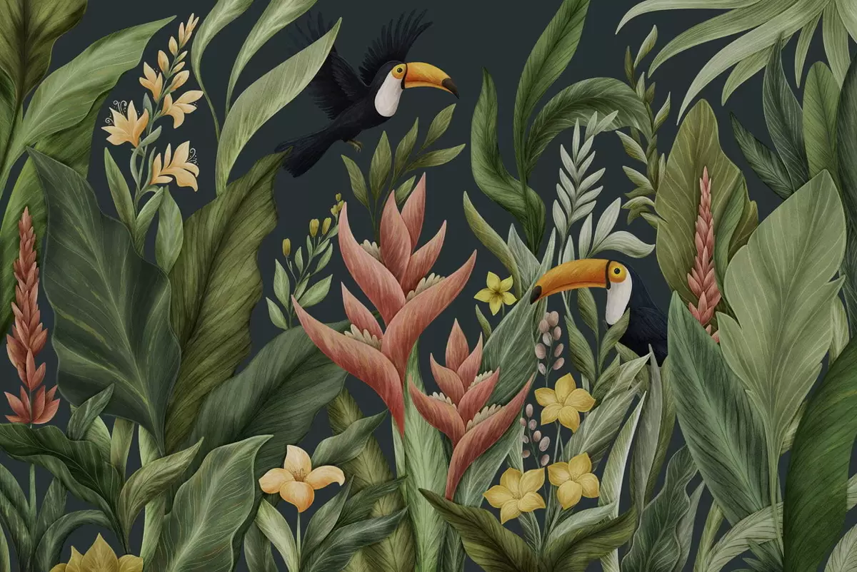 Murais de parede Plantas tropicais e aves de bico grande sobre fundo escuro Nr. w05088v2