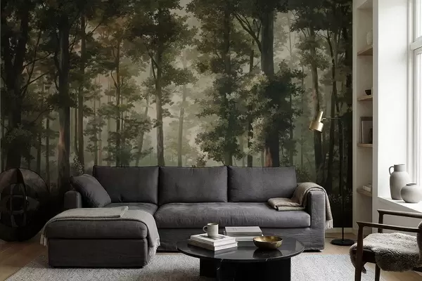 Murais de parede Ilustração de floresta com neblina, árvores altas e um caminho Nr. w05089