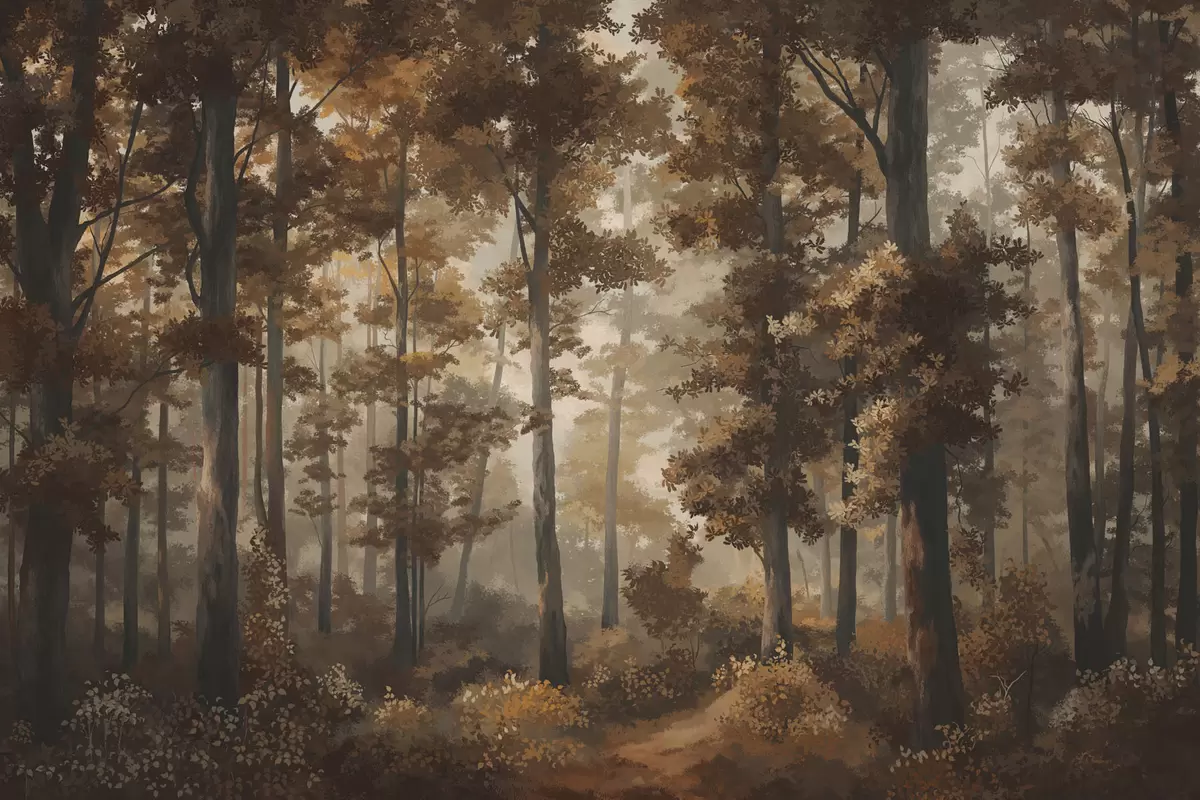 Murais de parede Cena de floresta no outono com luz quente e árvores densas Nr. w05089v1