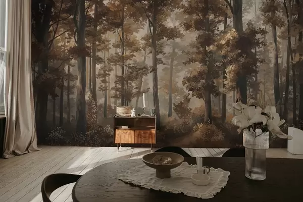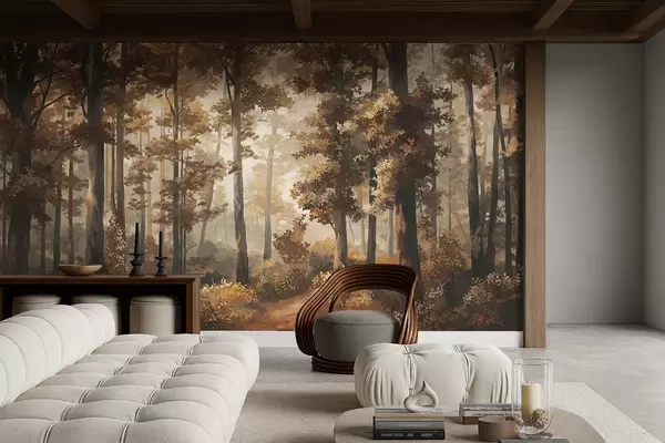 Murais de parede Cena de floresta no outono com luz quente e árvores densas Nr. w05089v1