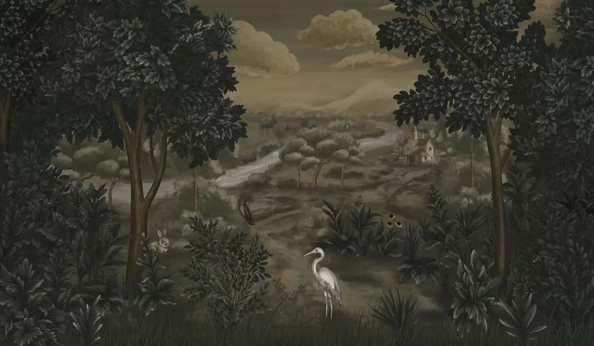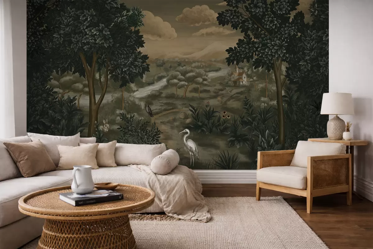 Murais de parede Paisagem fantástica com rio, casa e pássaros entre as árvores Nr. w05090