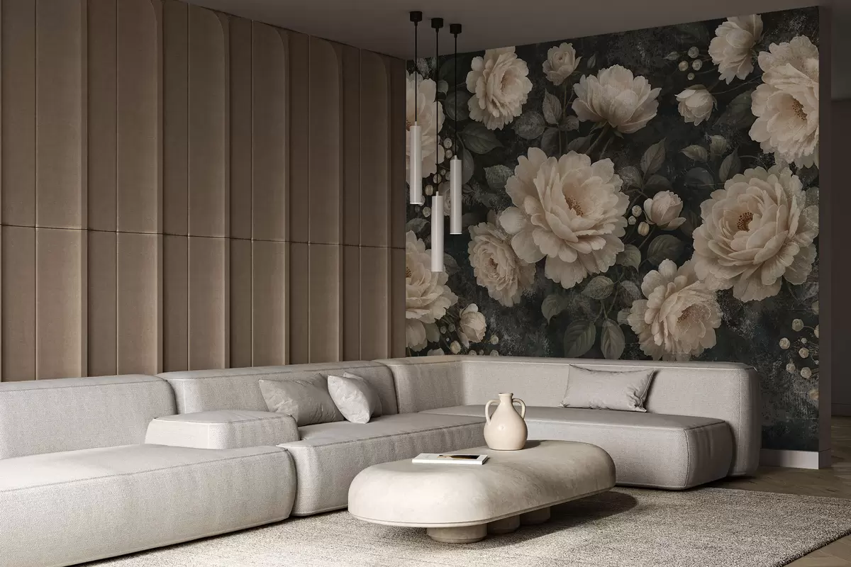 Murais de parede Flores volumosas em tons de bege sobre fundo escuro Nr. w05114