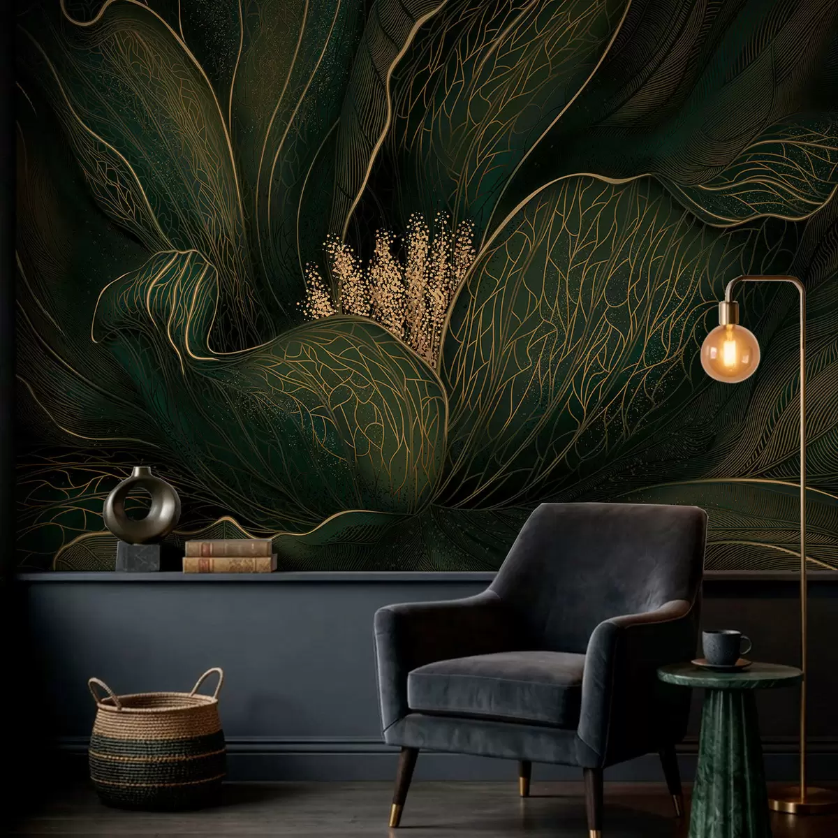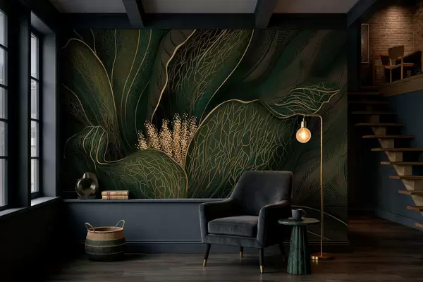 Murais de parede Flor abstrata verde-escura com detalhes em linhas finas Nr. w05119v1