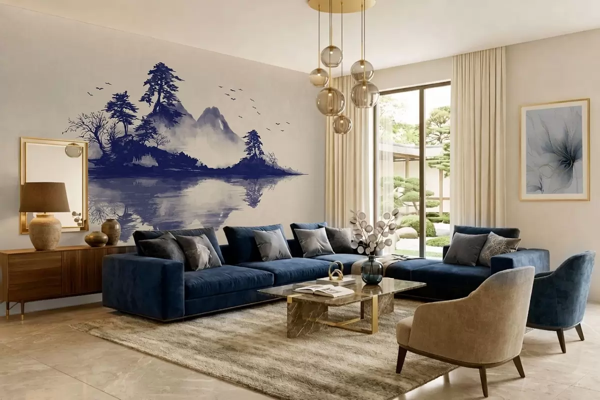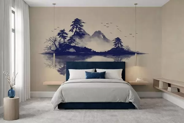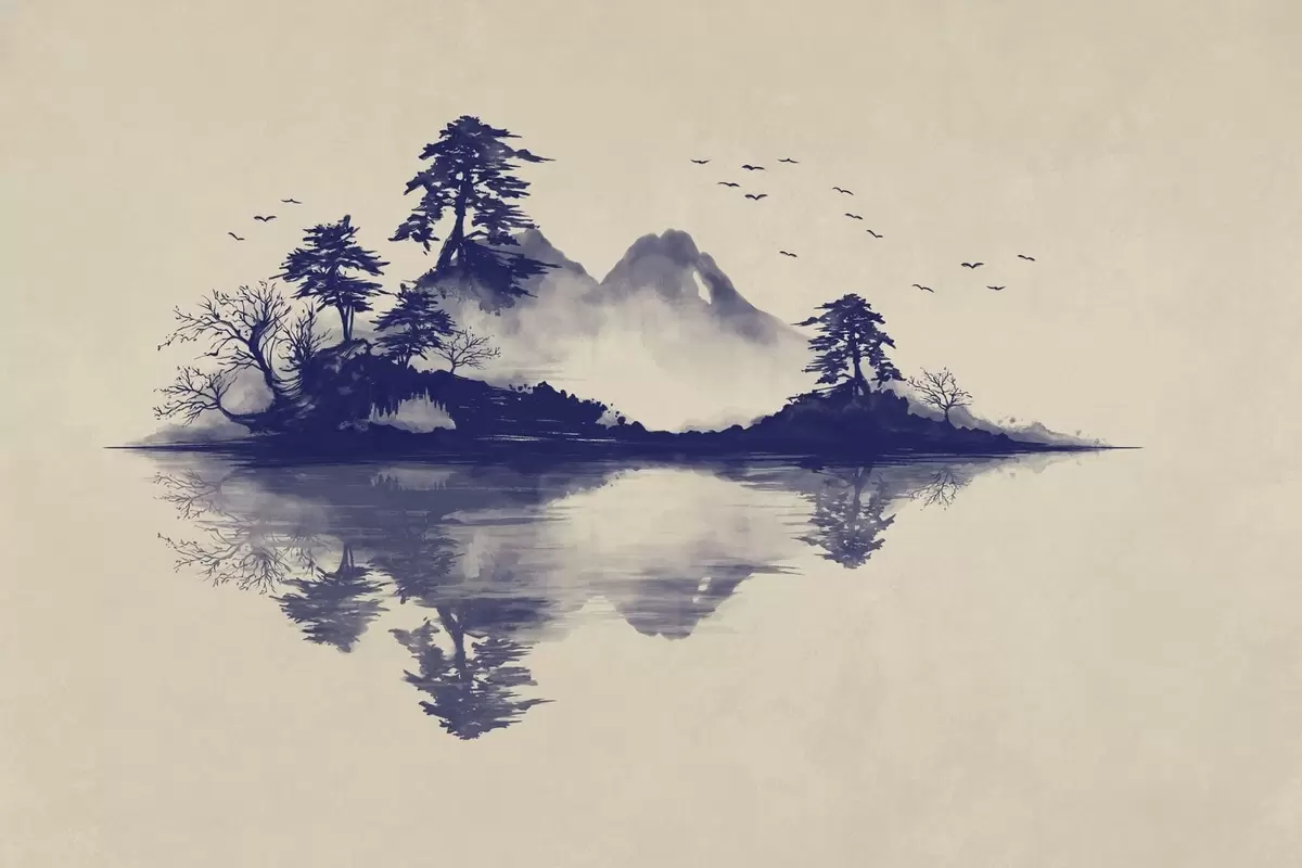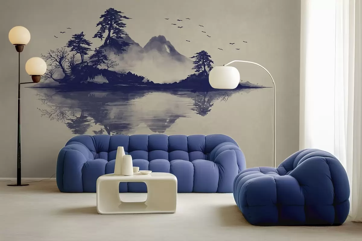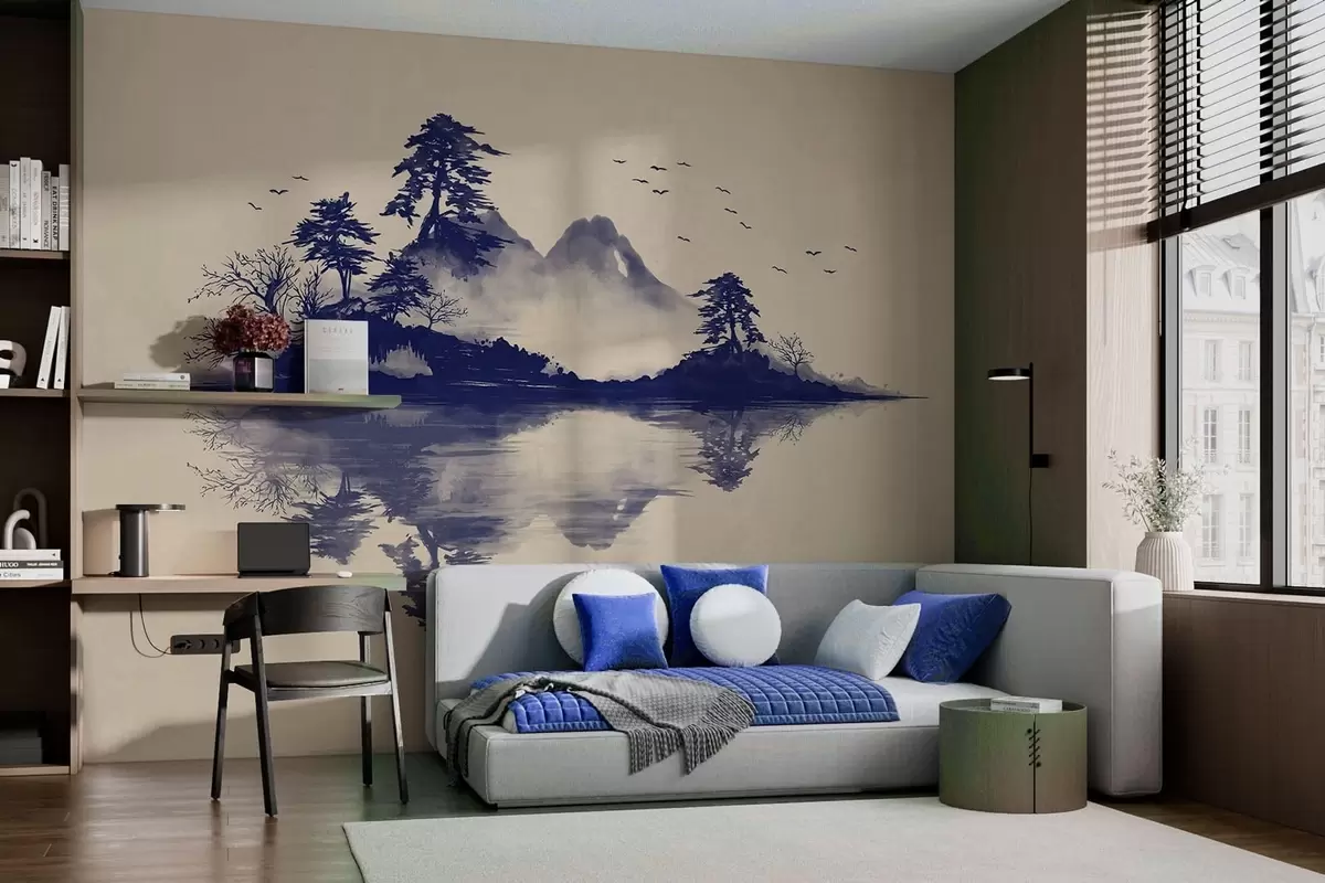 Murais de parede Paisagem montanhosa em sumi-e em tons de azul Nr. w05124v2