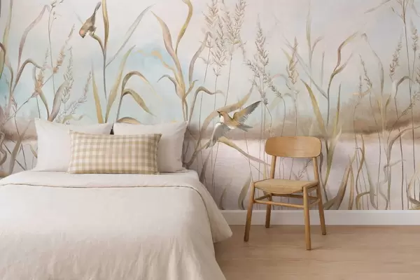 Murais de parede Ilustração de juncos e pássaros à beira da água em tons suaves Nr. w05125