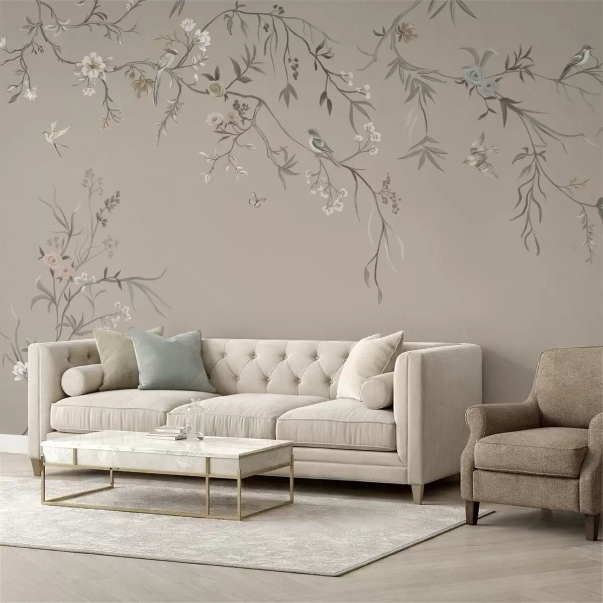 Murais de parede Ornamento floral com pássaros sobre fundo neutro Nr. w05127v3