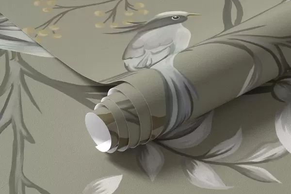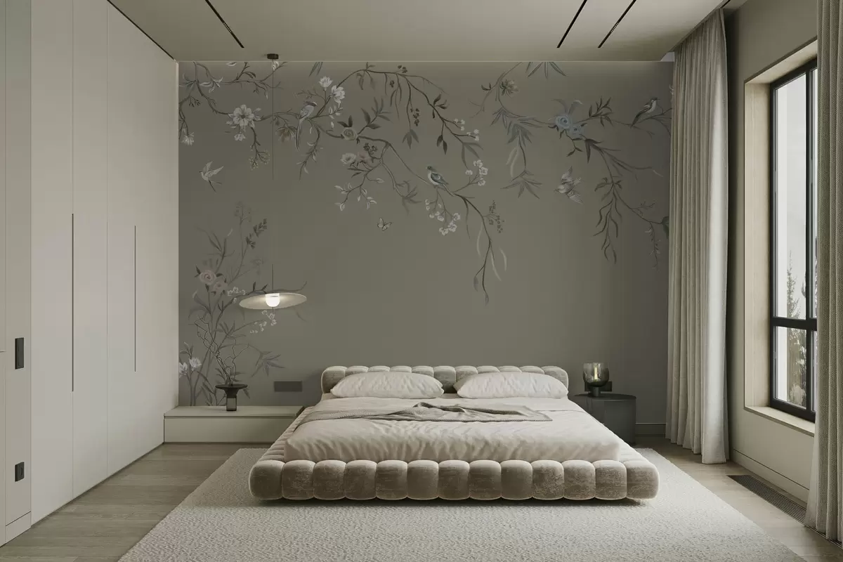 Murais de parede Motivo floral com pássaros sobre fundo cinzento Nr. w05127v4