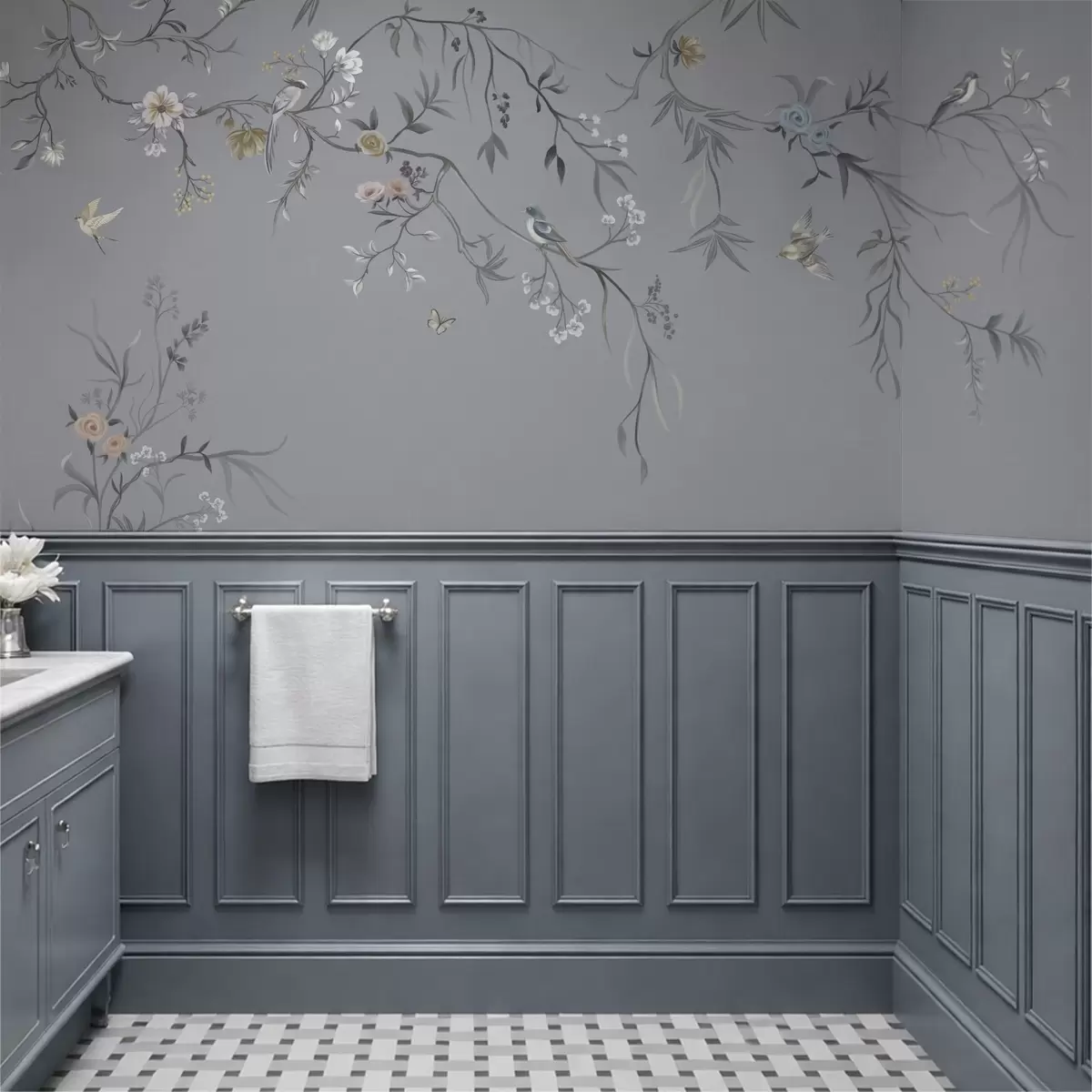 Murais de parede Ramos florais com pássaros sobre fundo esverdeado Nr. w05127v5
