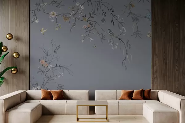 murais de parede Ramos florais com pássaros sobre fundo esverdeado w05127v5