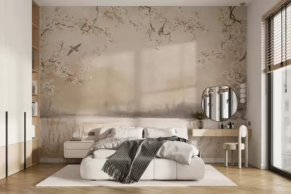 Murais de parede Ramos delicados em flor junto ao lago com pássaros numa leve névoa Nr. w05155