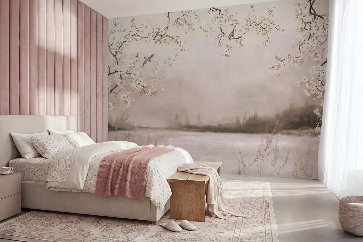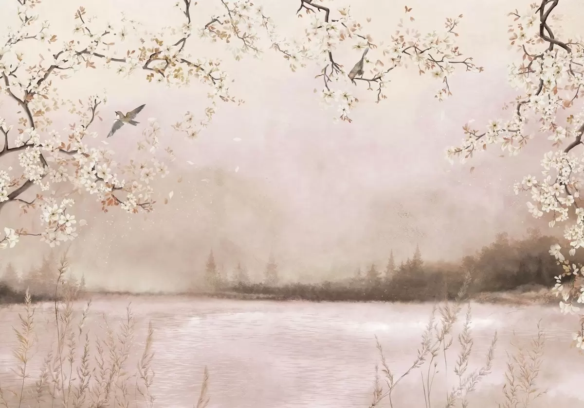 Murais de parede Galhos floridos sobre um lago calmo com pássaros na névoa Nr. w05155v1