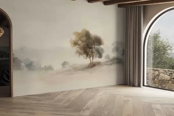 Murais de parede Paisagem minimalista com uma árvore solitária na névoa Nr. w05223