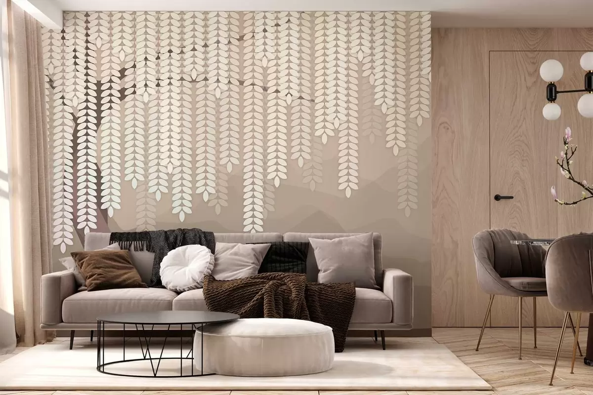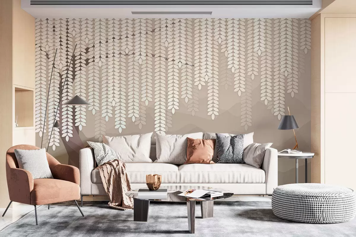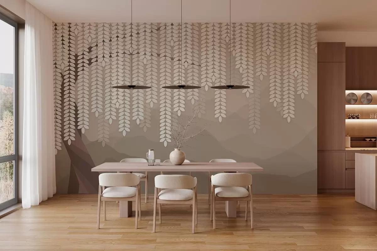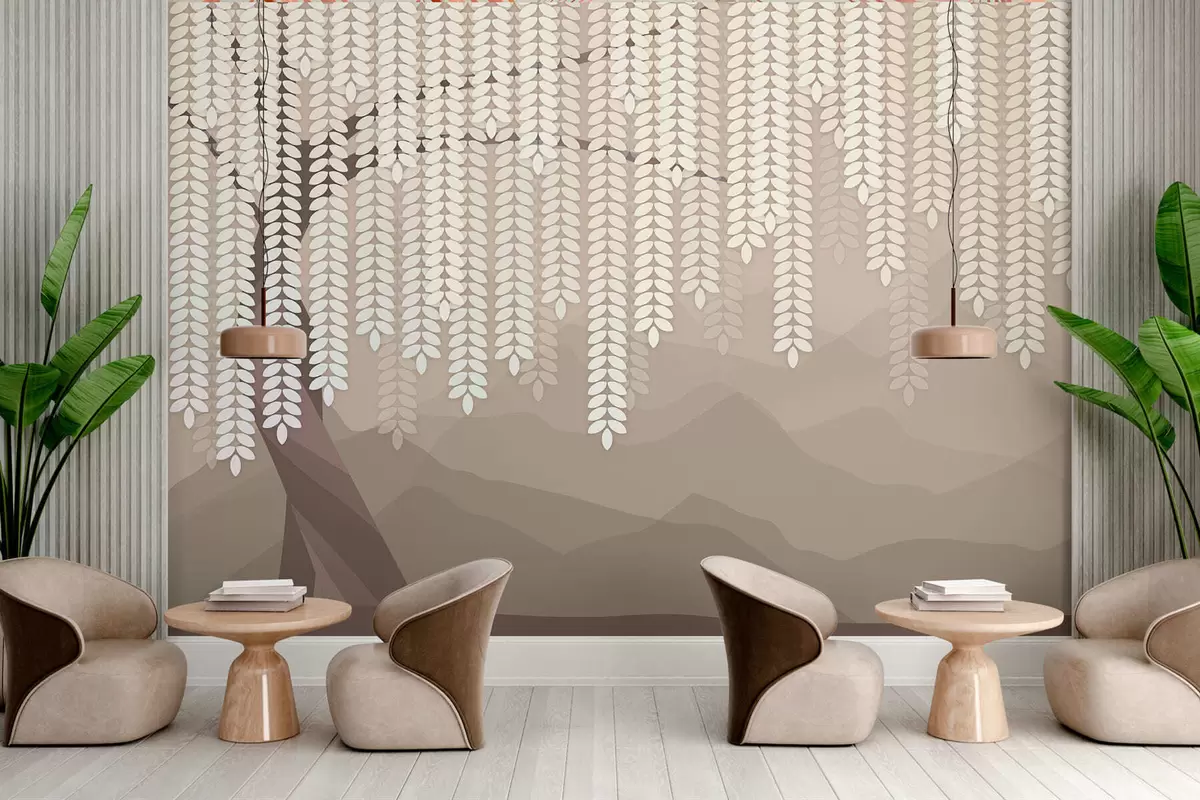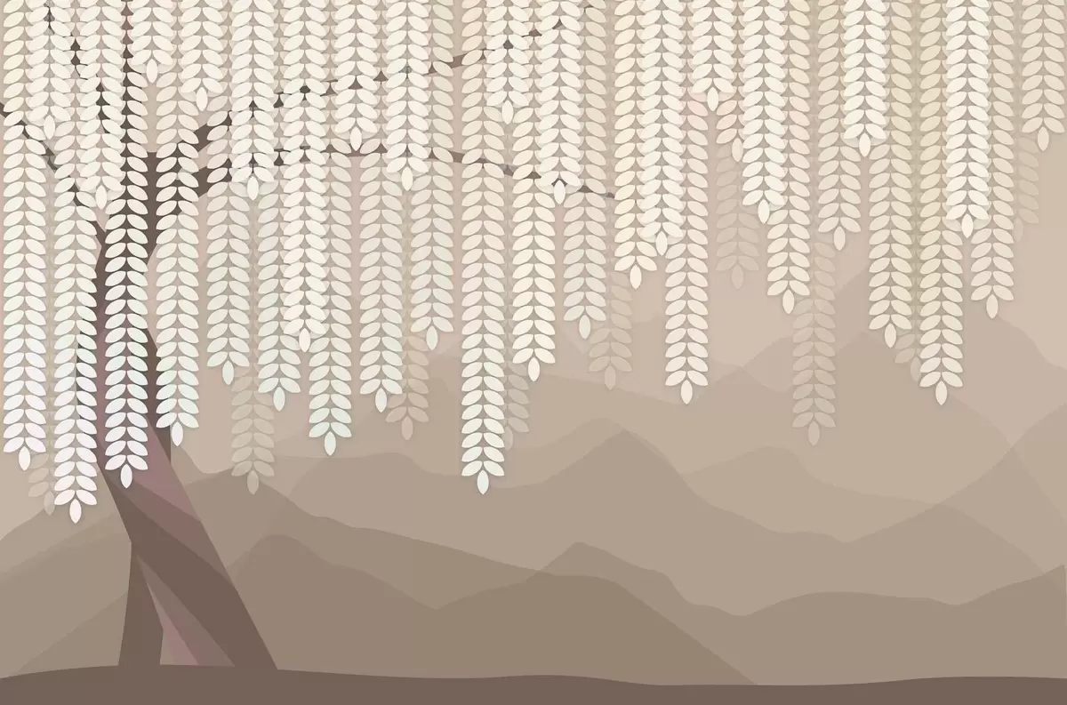 Murais de parede salgueiro estilizado com folhas pendentes contra um fundo de montanhas minimalistas em tons de café Nr. w05232v2