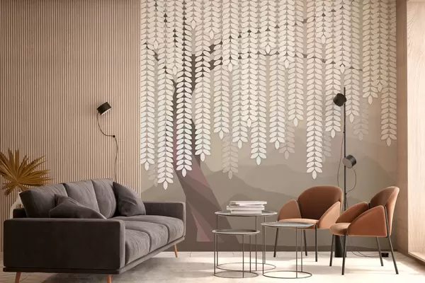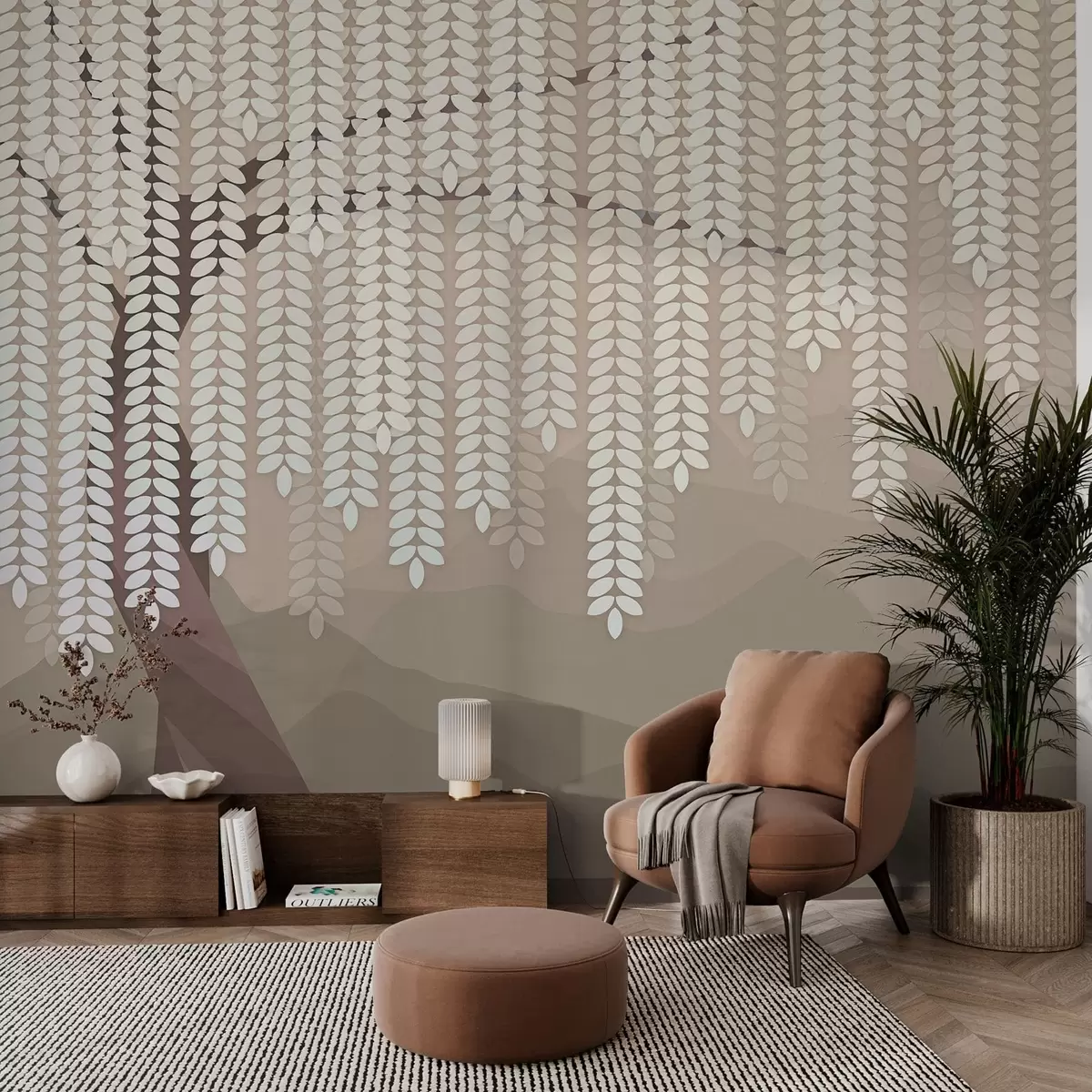 Murais de parede salgueiro estilizado com folhas pendentes contra um fundo de montanhas minimalistas em tons de café Nr. w05232v2