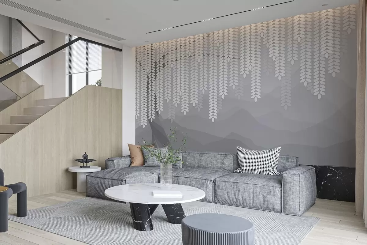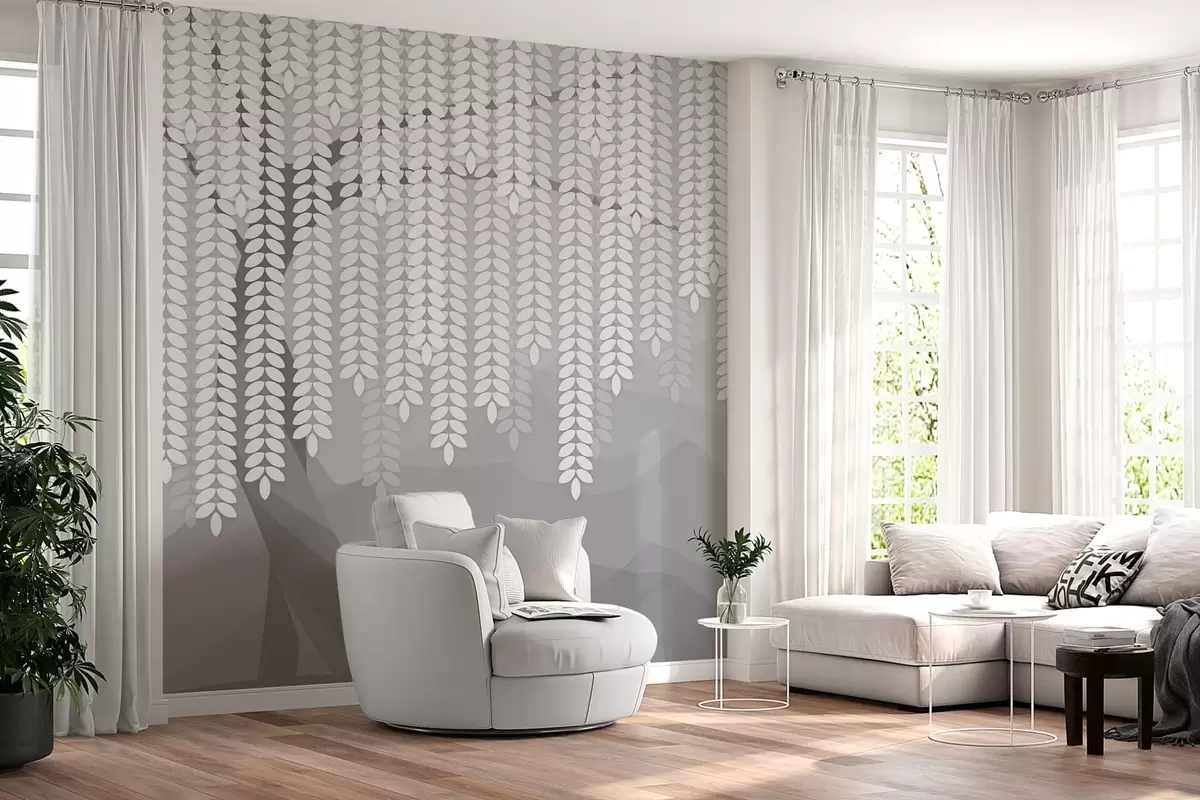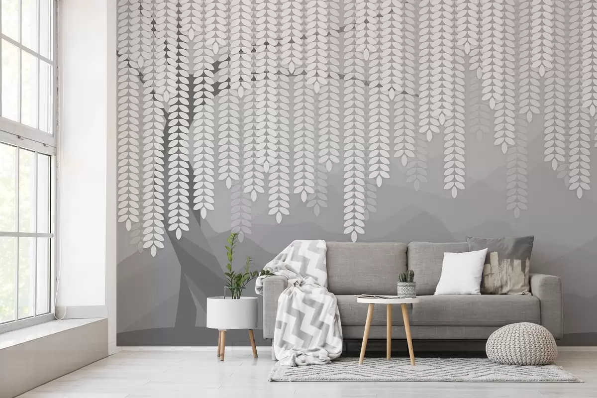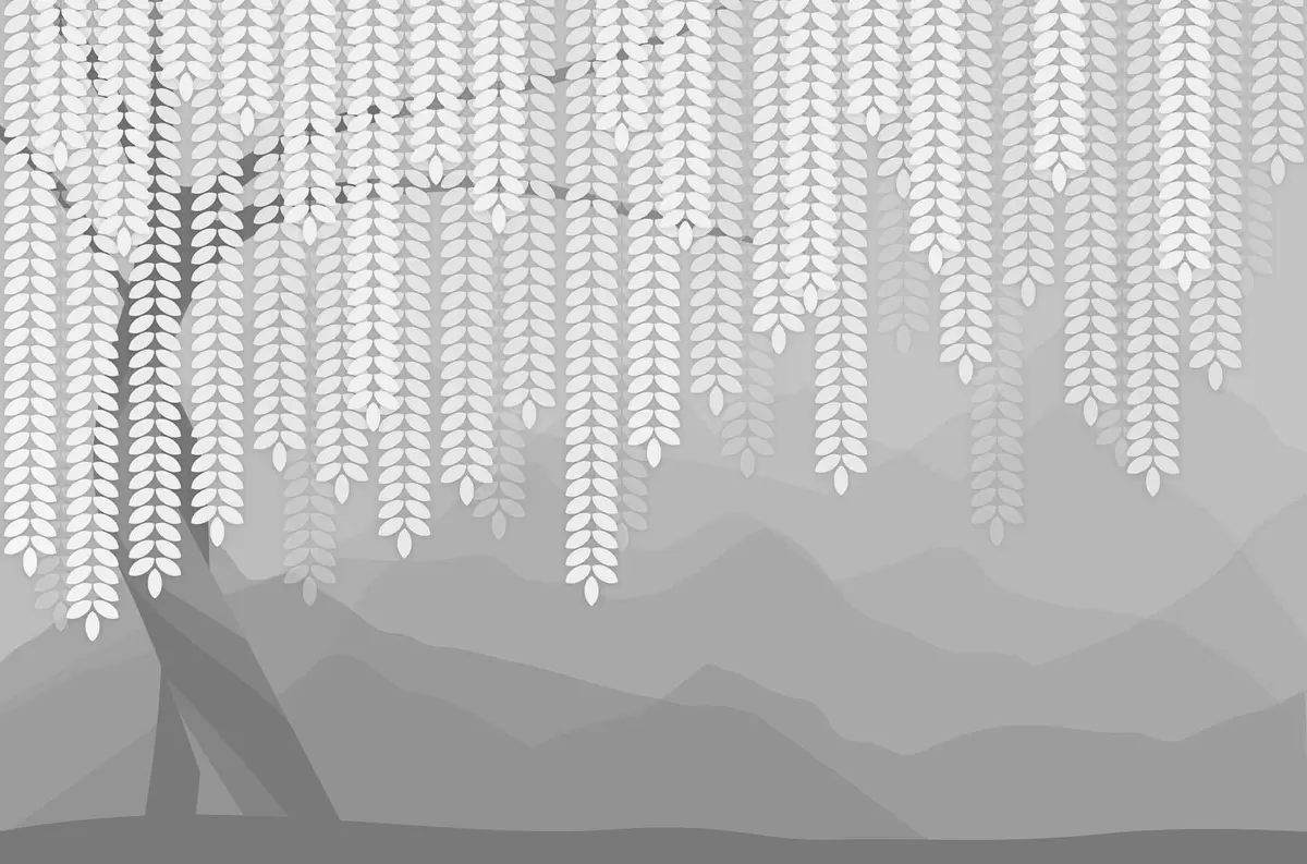 Murais de parede salgueiro estilizado com folhas pendentes contra um fundo de montanhas minimalistas em tons de cinza Nr. w05232v3