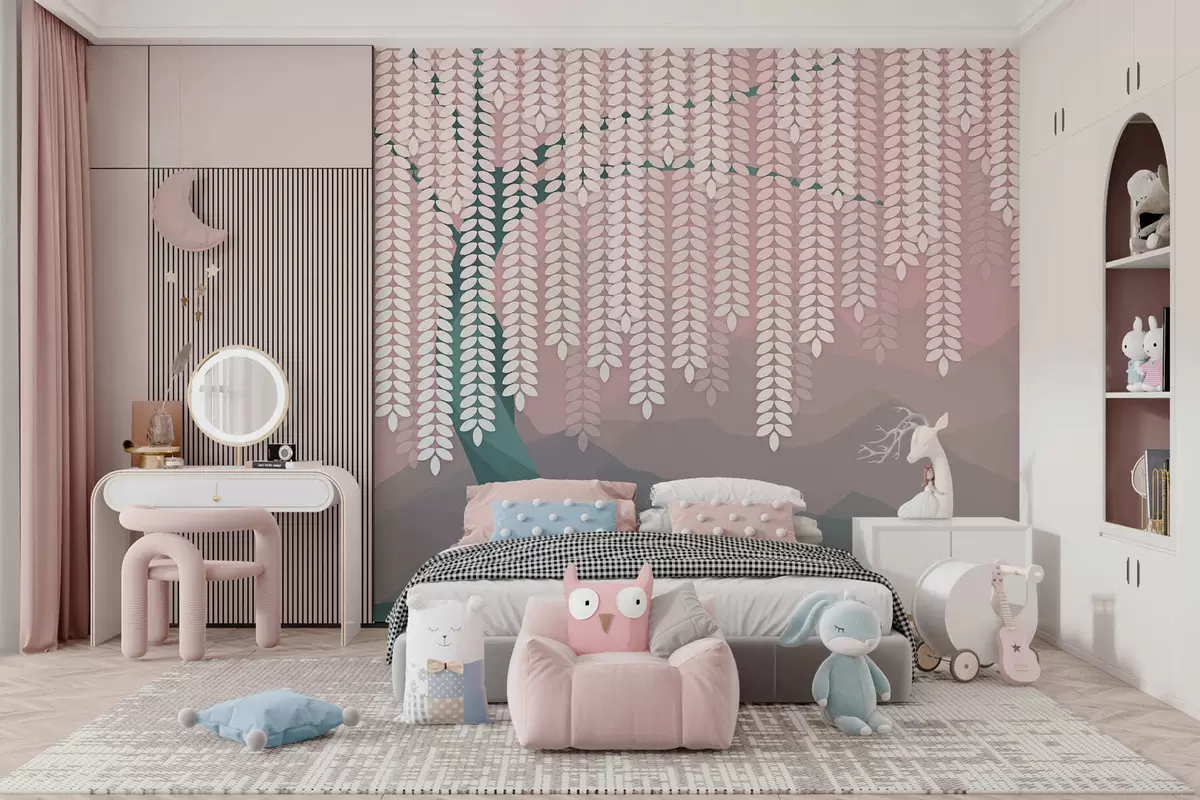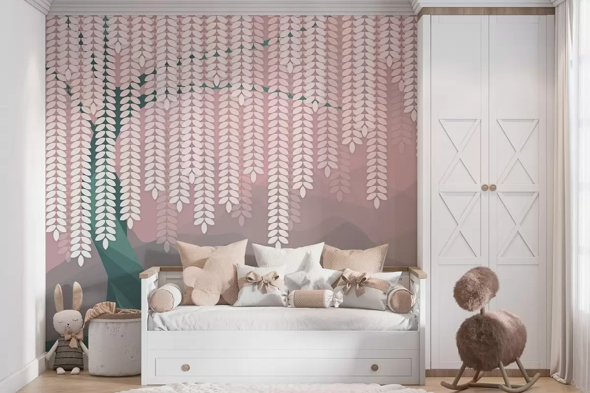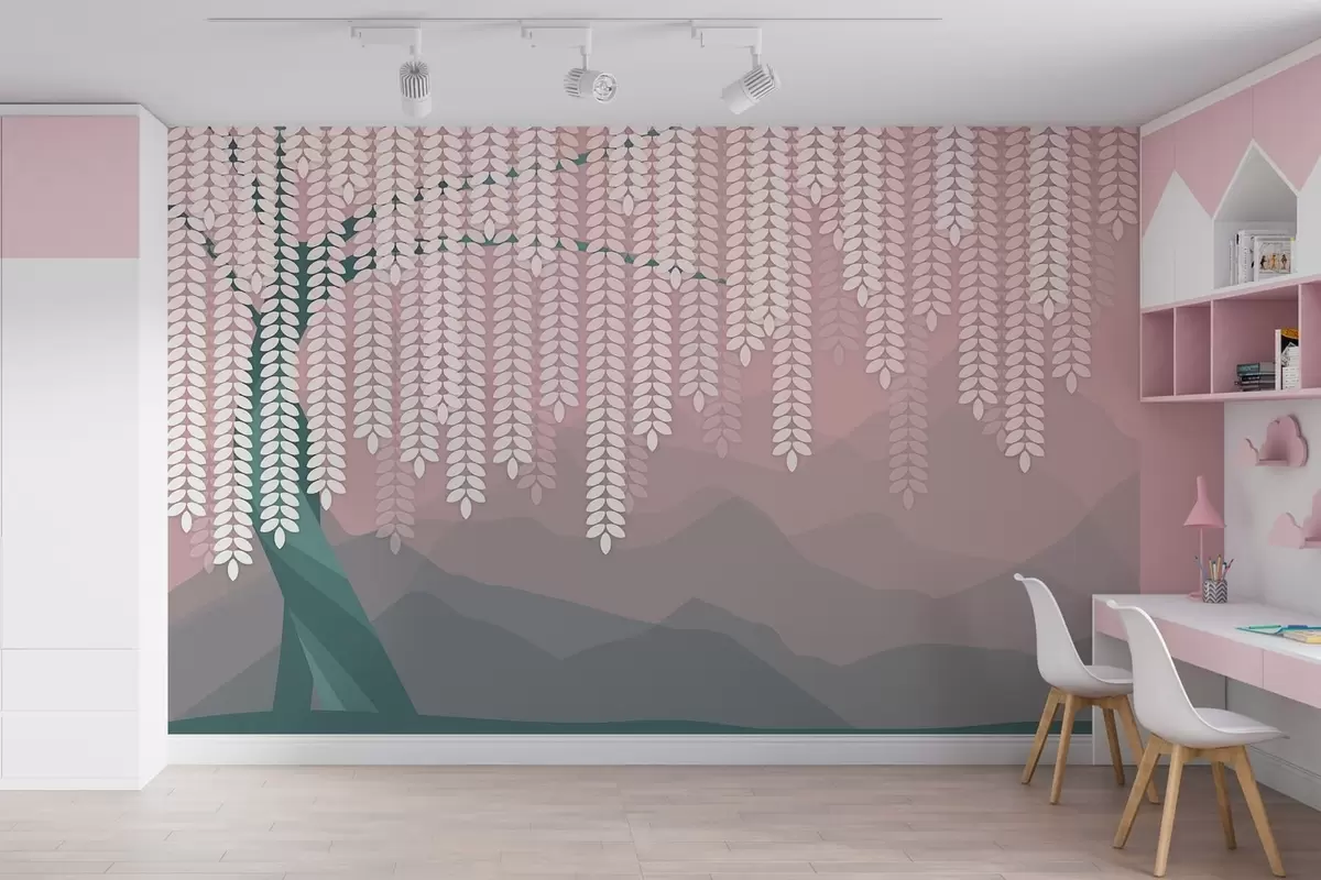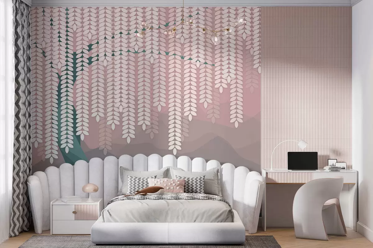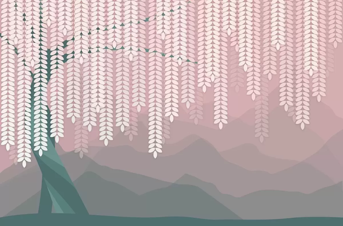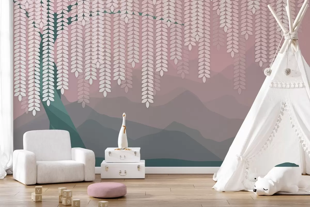Murais de parede salgueiro estilizado com folhas pendentes contra um fundo de montanhas minimalistas em tons de rosa e verde escuro Nr. w05232v4